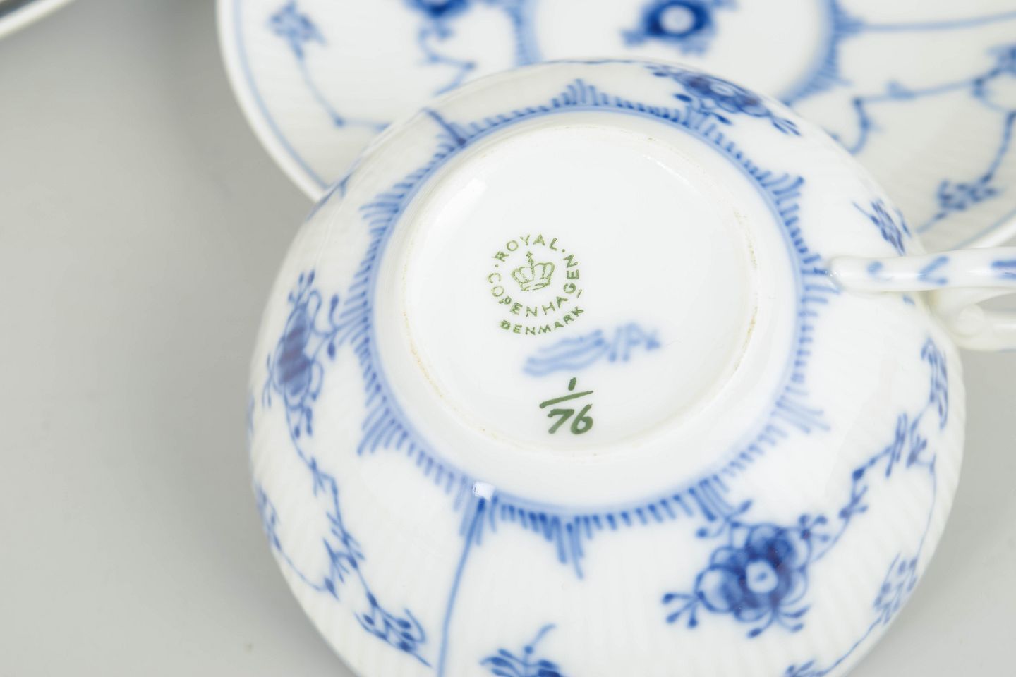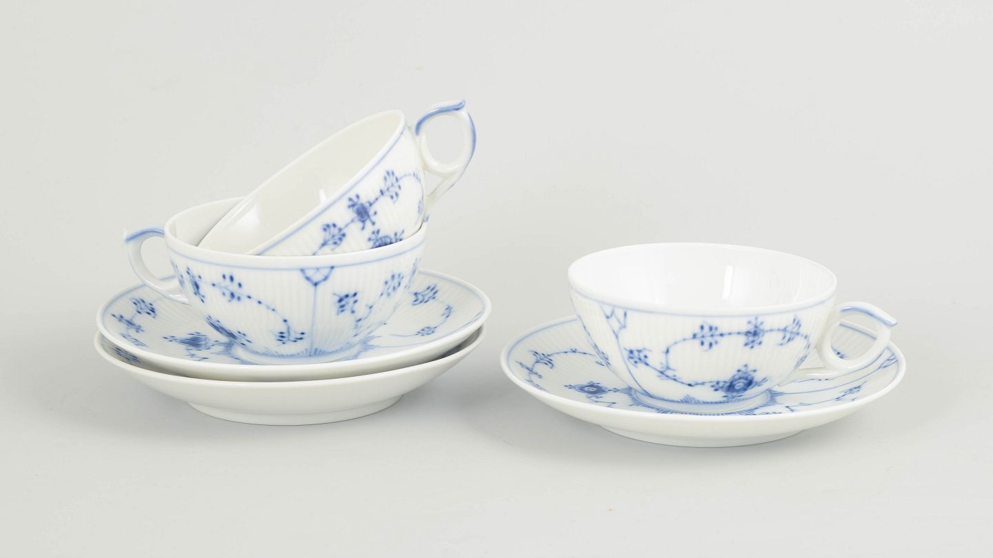 Royal Copenhagen Musselmalet Riflet sæt af tre tekopper med tilhørende underkopper.