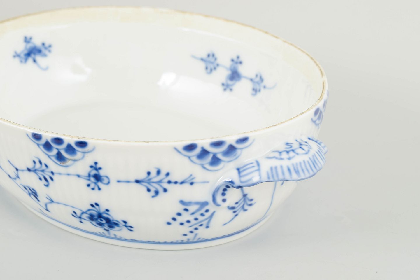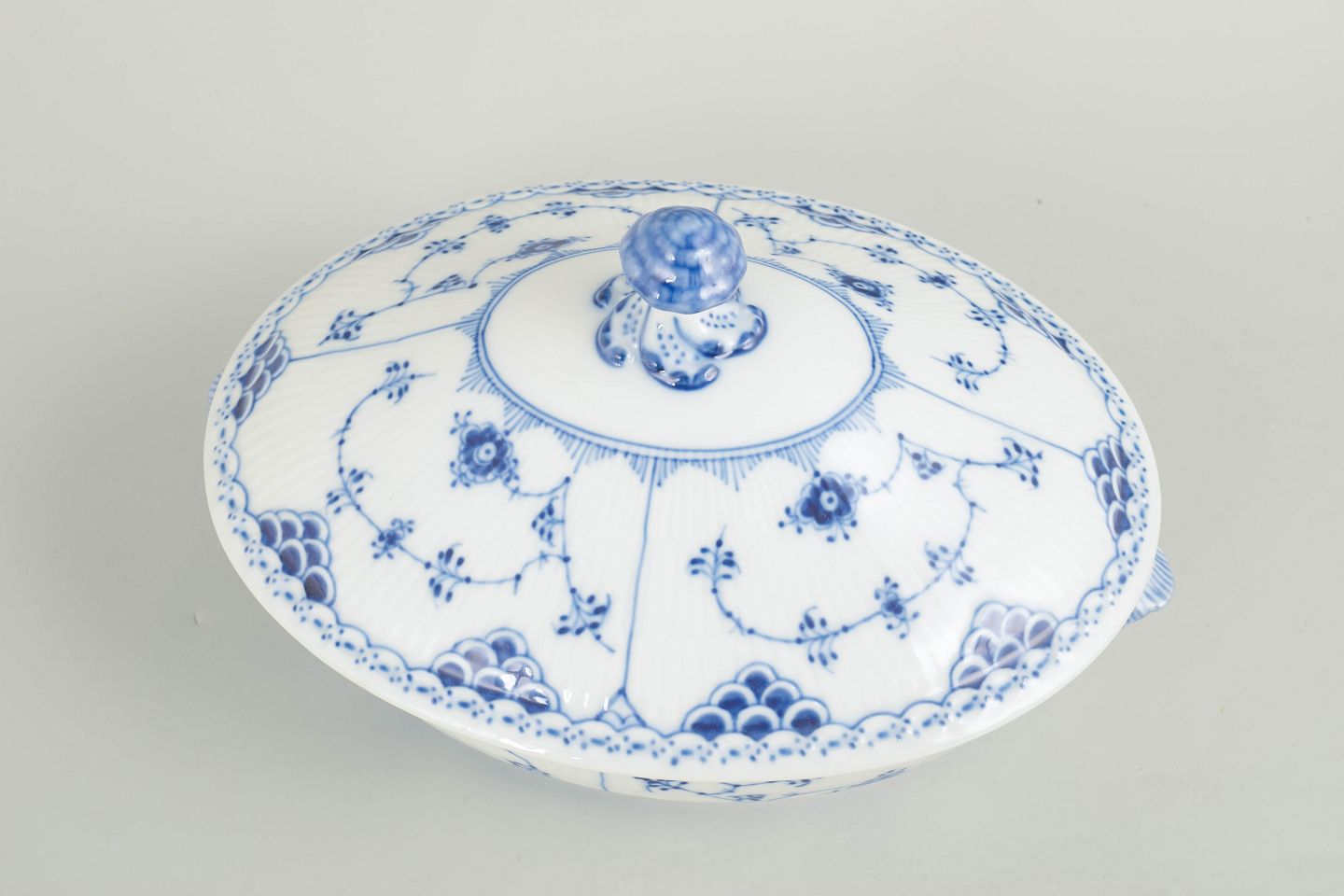 Oval terrin med låg i håndmalet porcelæn fra Musselmalet Halvblonde med klassisk underglasurdekoration i koboltblå og karakteristisk blondekant. Model 1/622. H. 16 cm, B. 26 cm. Første sortering. Fremstillet i 1980’erne.
