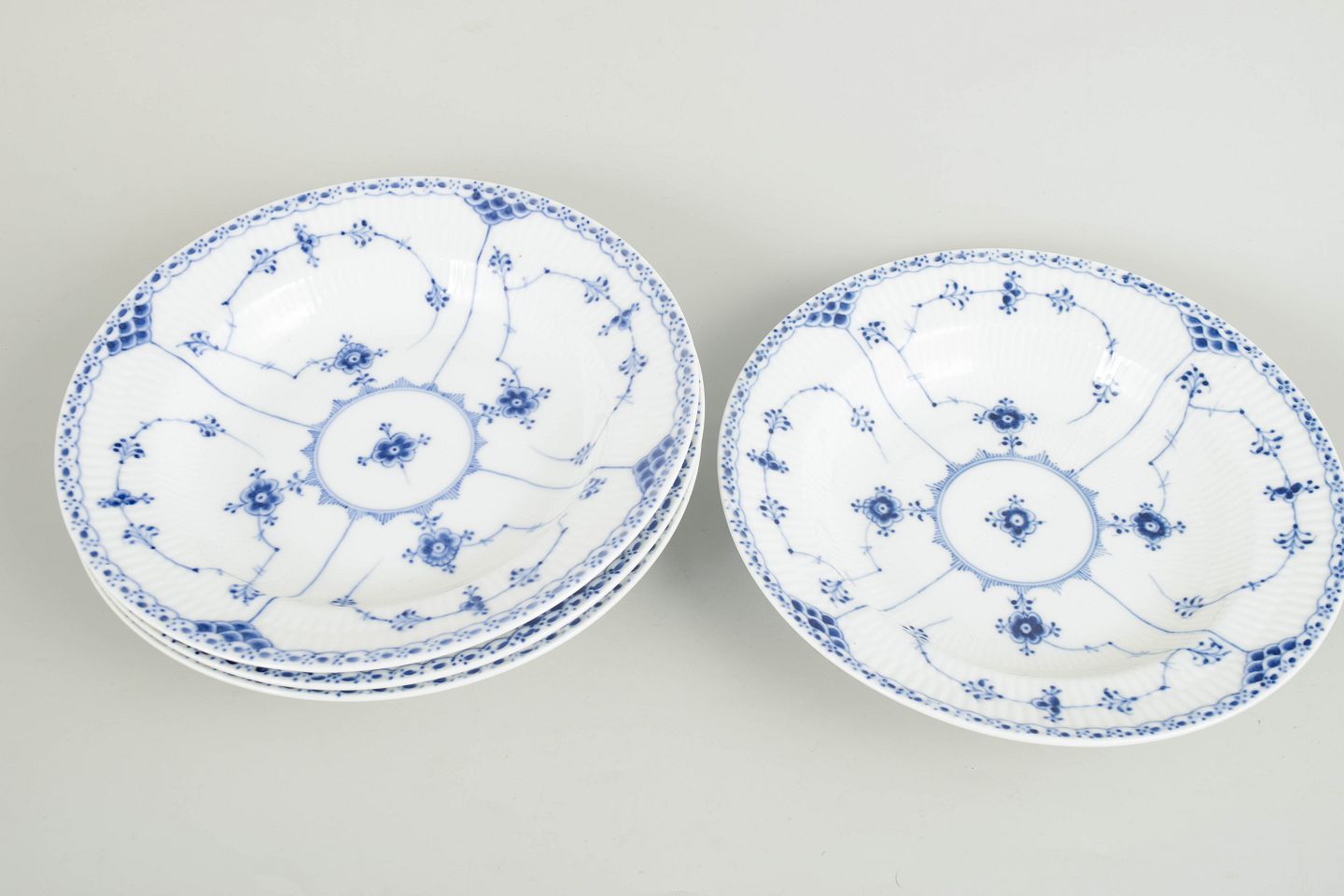 Sæt af fire dybe tallerkener i håndmalet porcelæn fra Musselmalet Halvblonde med klassisk underglasurdekoration i koboltblå og karakteristisk blondekant. Model 1/565. Første sortering.