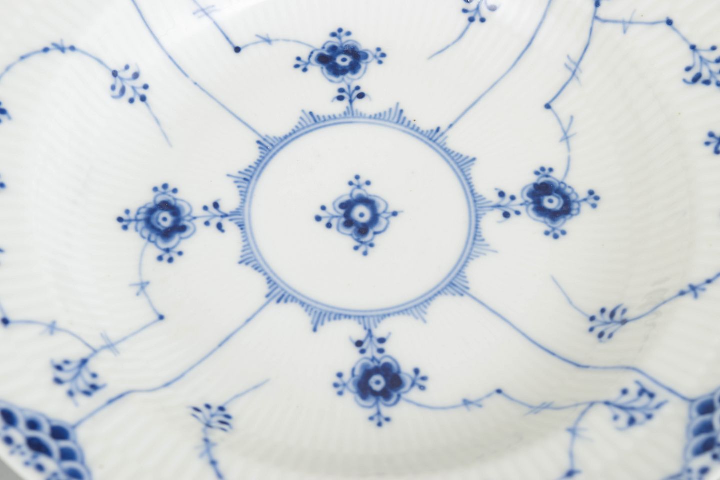 Royal Copenhagen blev grundlagt i 1775 i København under kongelig bevilling. Fabrikken er internationalt anerkendt for sit håndmalede porcelæn og sit høje kunstneriske niveau. Musselmalet Halvblonde er en variation af det klassiske Musselmalet stel og kombinerer riflede flader med en dekorativ blondekant, udført med stor håndværksmæssig præcision.