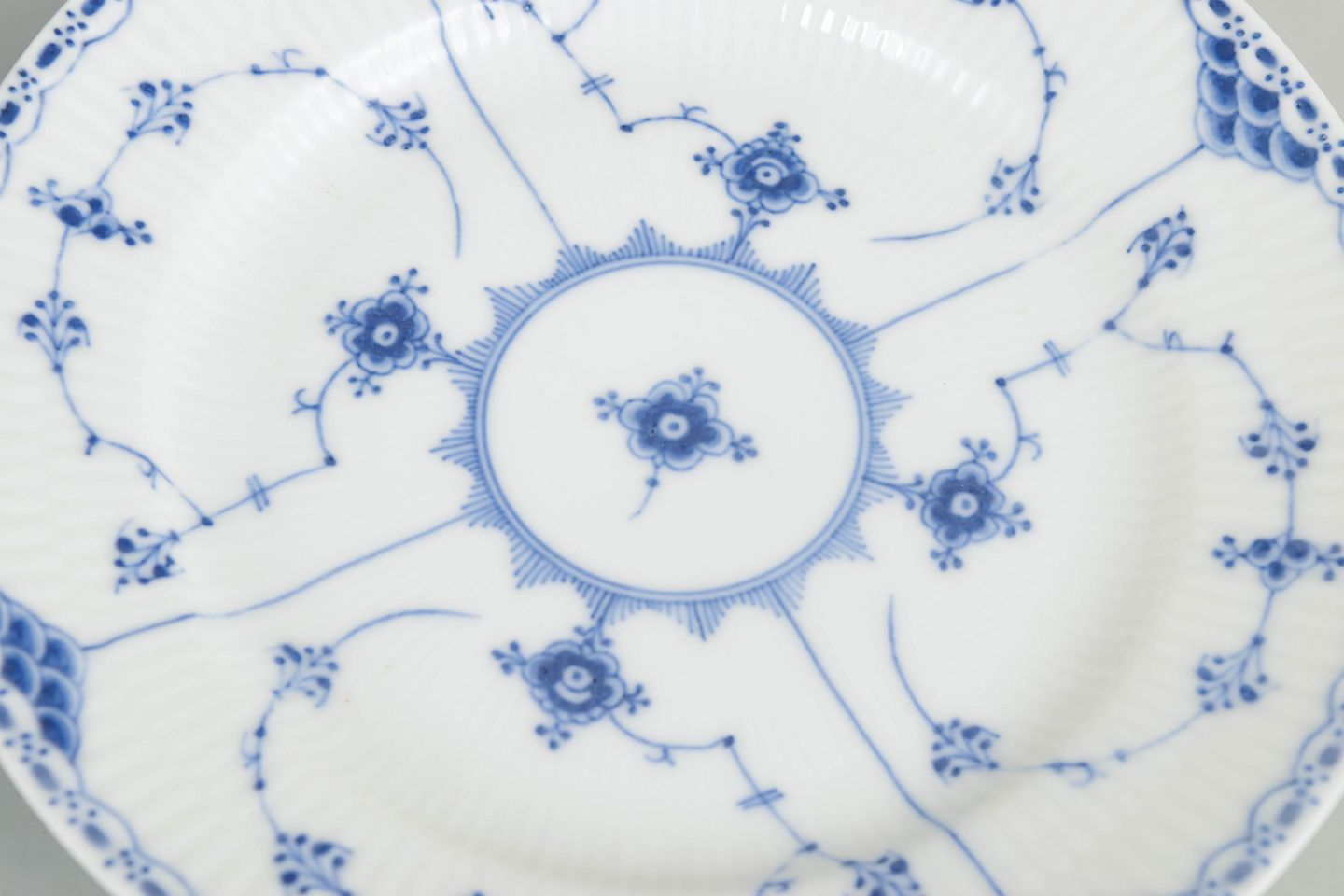 Sæt af fire tallerkener i håndmalet porcelæn fra Musselmalet Halvblonde med klassisk underglasurdekoration i koboltblå og karakteristisk blondekant. Tre tallerkener model 1/573 og én tallerken model 1/652. Første sortering.
