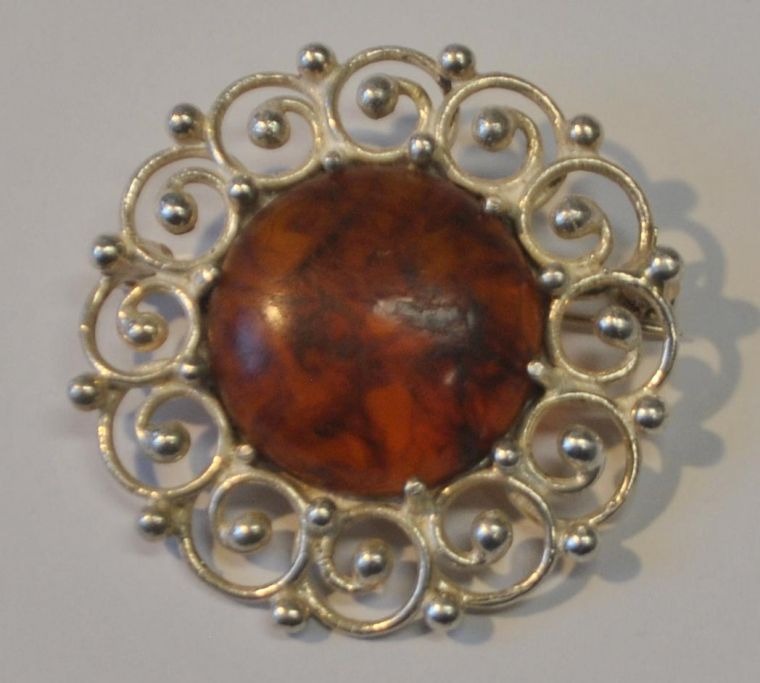 Herman Siersbøl (efter1948) København, Danmark: Sterling sølvbrosche med rav. Stemplet. Dia.: 4,4 cm.