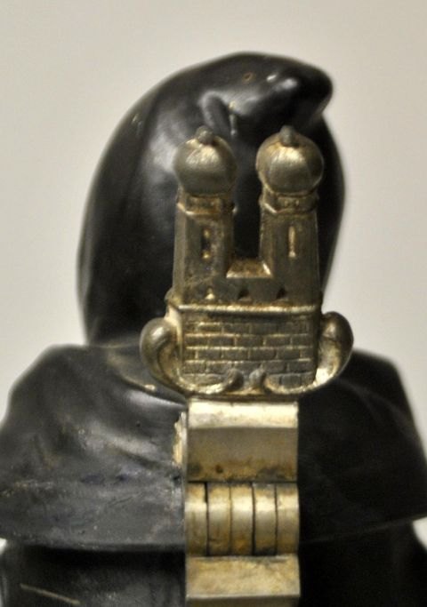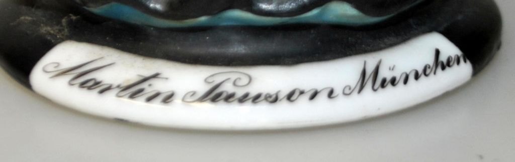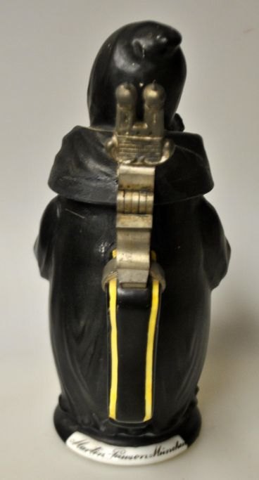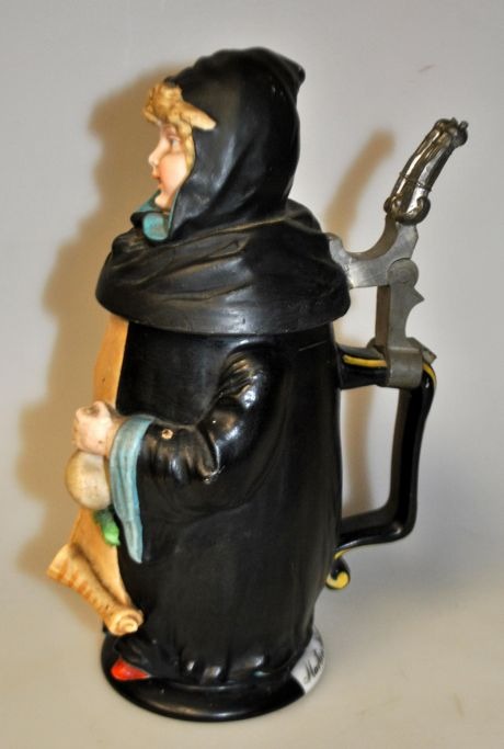 Martin Pauson (1861 - 1934) Tyskland: Ølkrus med "Münchner Kindl", der er en munk. Håndbemalet bisquit porcelæn. Krus med hank og gæk af tin, i form af Frauenkirke. I bunden lithophane med bymotiv. Signeret: Martin Pauson, München. Højde.: 22 cm.