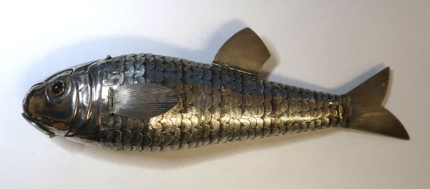 Sølv hovedvandsæg i form af stor fisk med røde sten (830). Længde 17 cm