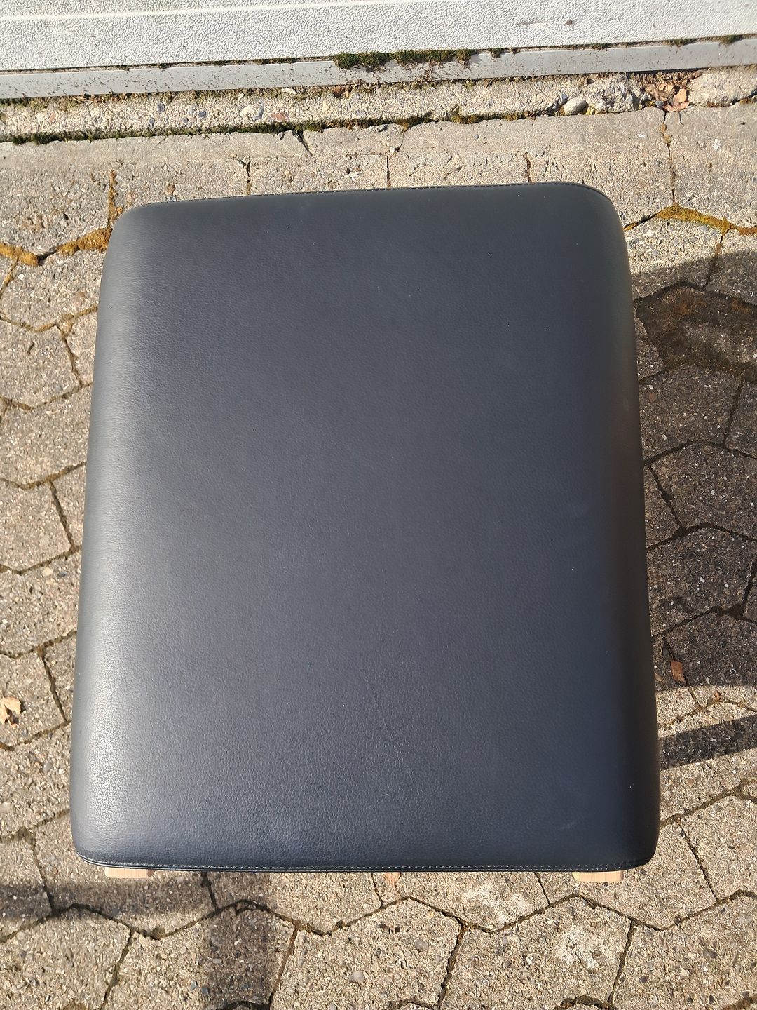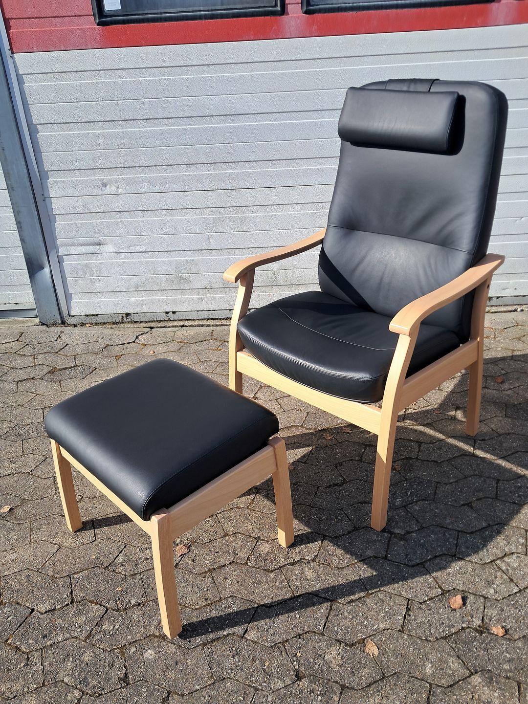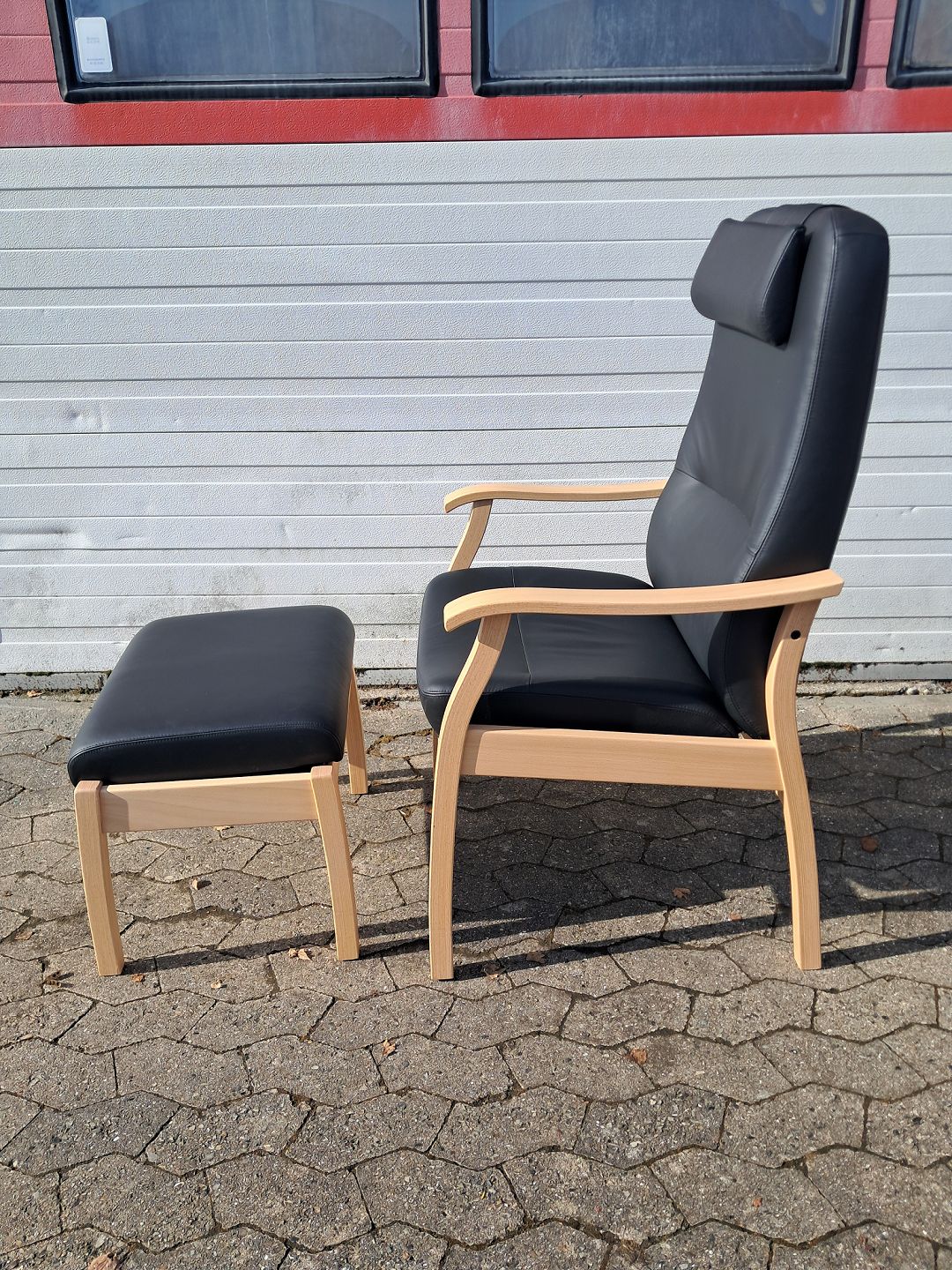 Farstrup lænestol og skammel i bøgetræ med læderbetræk, fra 2010erne.