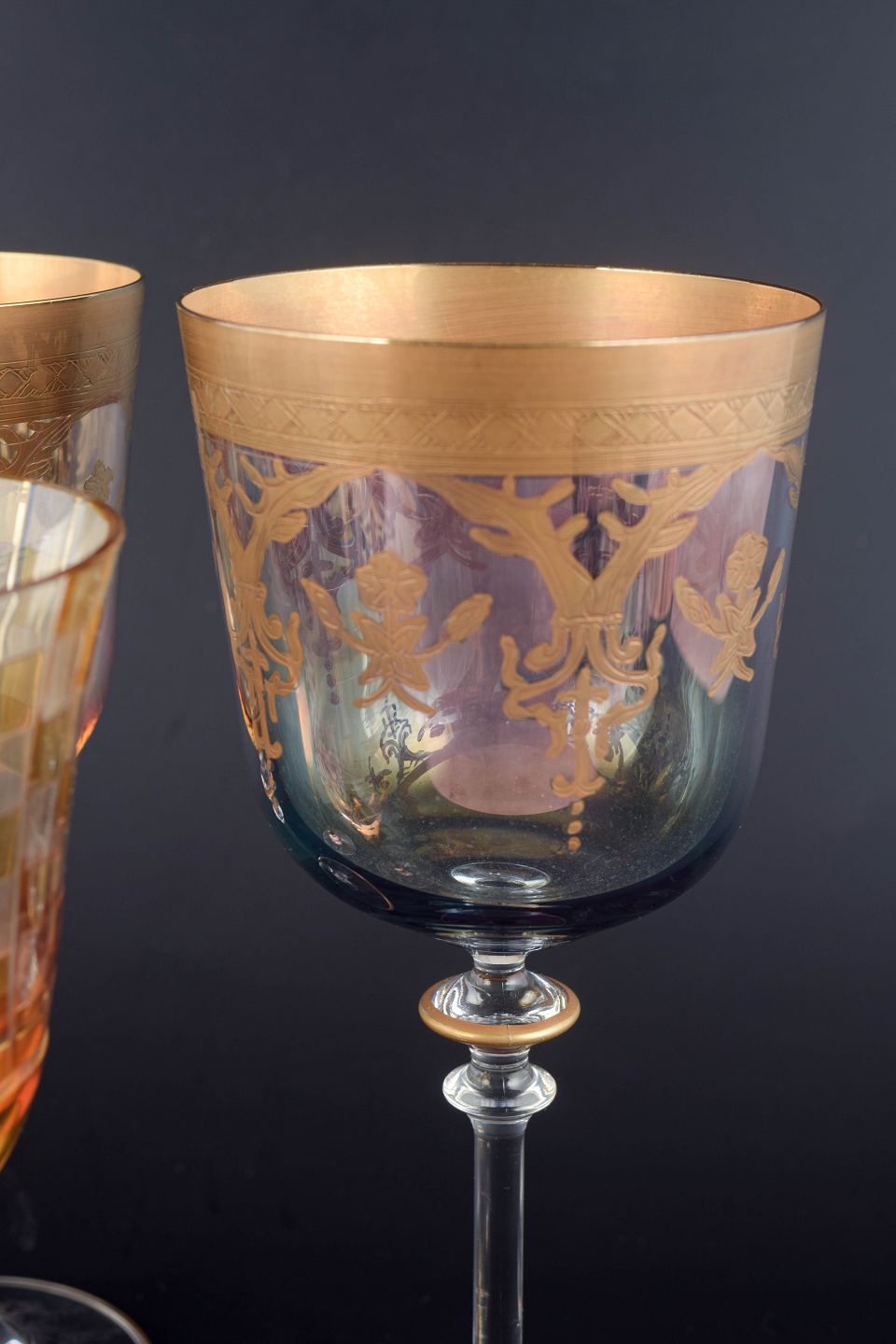 Elegante rødvinsglas i facetslebet og forgyldt krystal med ravfarvet cuppa og slank stilk. Dekoreret med geometrisk mønster og delvis mat forgyldning langs randen, typisk for bøhmisk glasproduktion fra mellemkrigstiden.