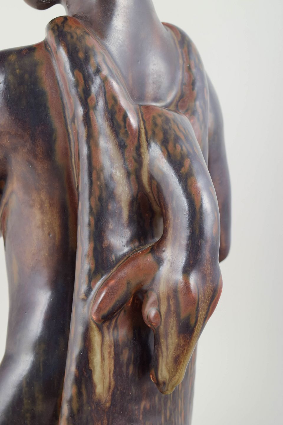 Imponerende monumental figur i stentøj, model 21096, udført i 1975 i begrænset oplag 2/15. Skulpturen fremstår naturalistisk modelleret med forenklede former og karakteristisk overfladebehandling, typisk for Johannes Hedegaards sene produktion hos Royal Copenhagen.