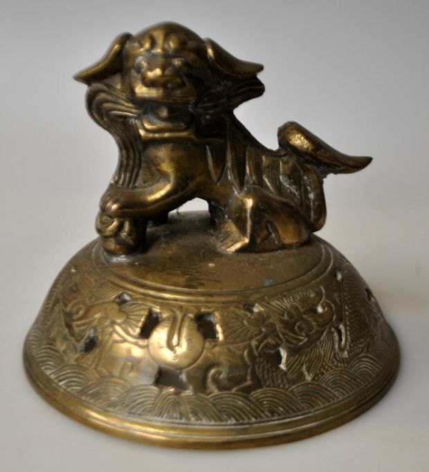 Kinesisk røgelseskrukke i bronze på tre ben, 19. årh. Med to ører; gennembrudt låg med dekoration i form af løve. På korpus dekoreret med drage og blomster. H.: 32 cm. B.: 25 cm. Stemplet.