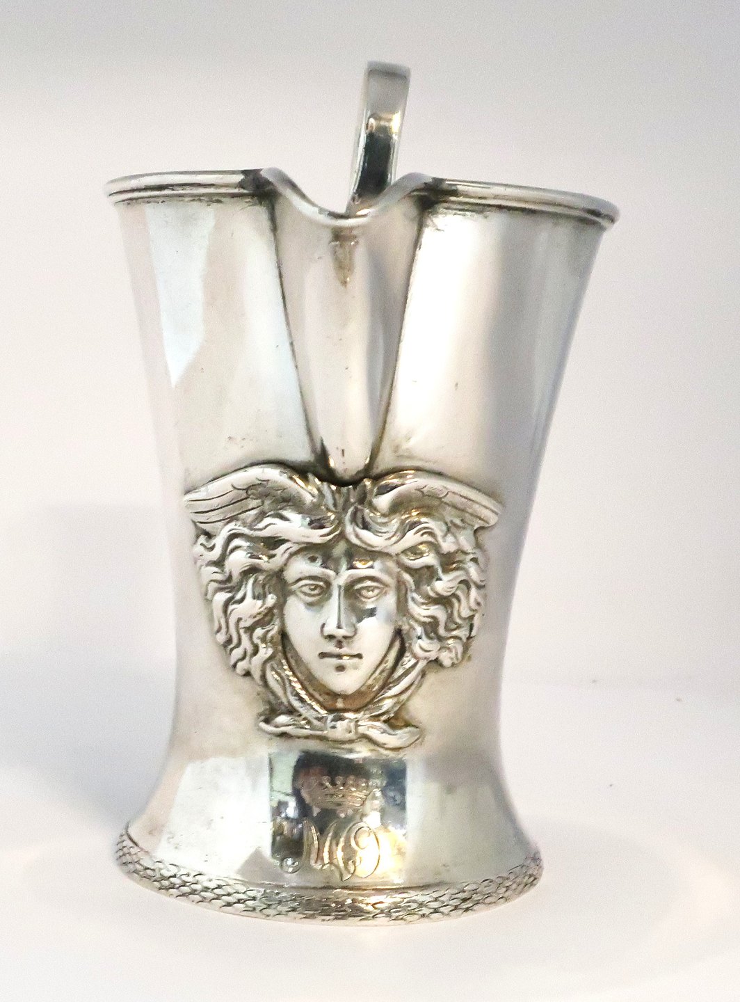 Gebr. Godet & Co, Berlin. Sølvkande med Medusa portræt (800). Højde 15 cm. Med grevekrone indgraveret.