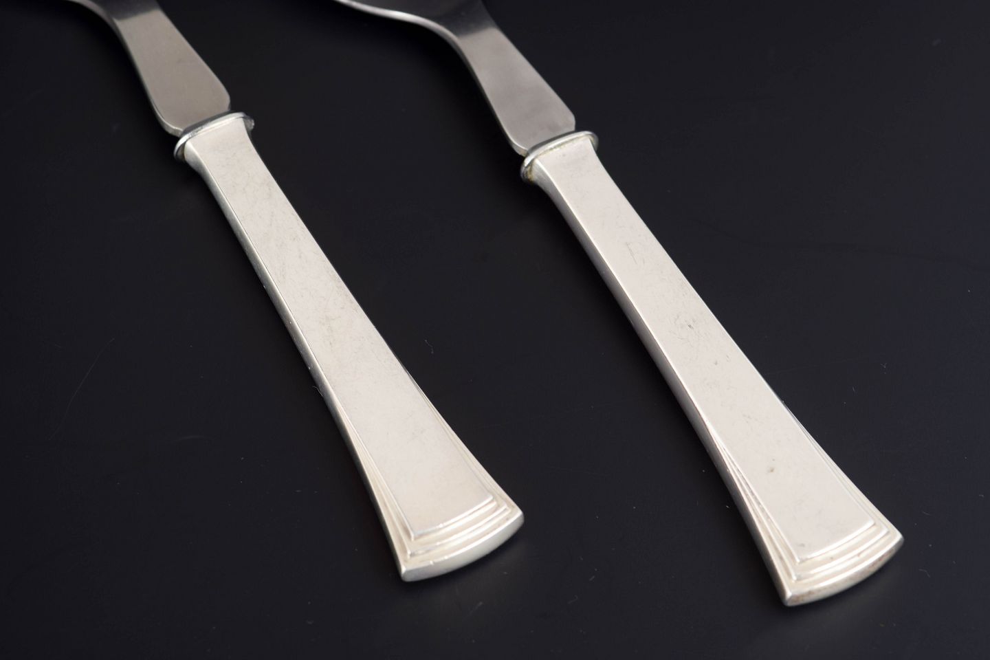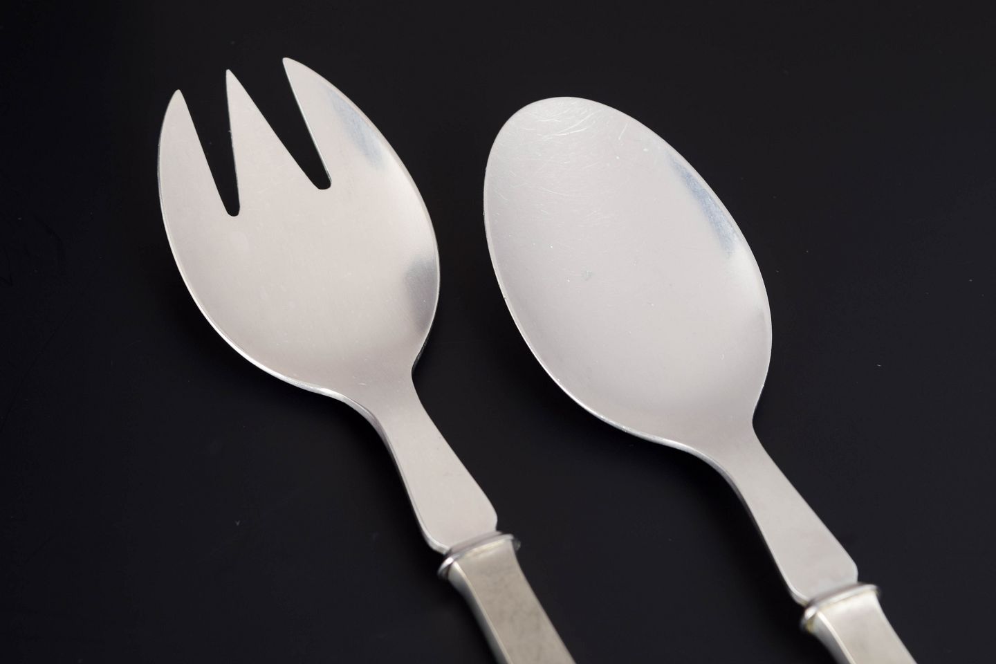 Elegant salad set in 830 silver and stainless steel consisting of a salad spoon and salad fork. Model number 32 with a classic handle form and subtle geometric terminal. Produced by Evald Nielsen.