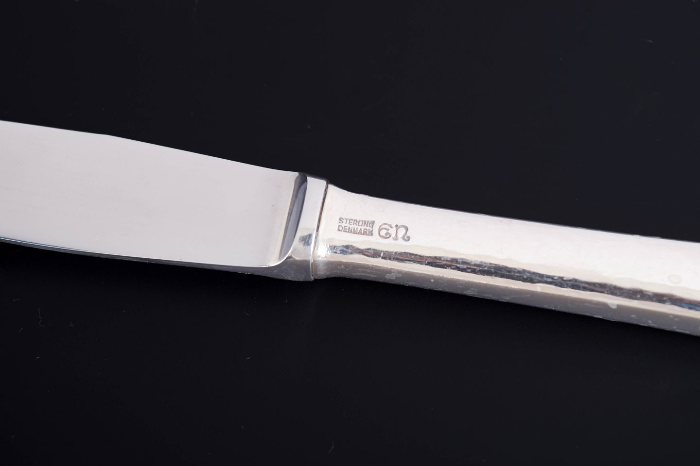 Elegant lunch knives in sterling silver and stainless steel. Model number 14 with a classic softly rounded handle with a subtle beaded edge and plain blade. Produced by Evald Nielsen.