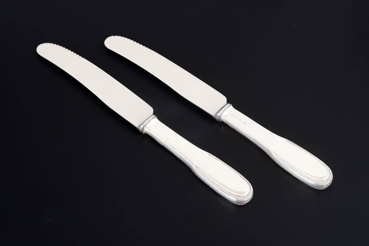 Elegante middagsknive i tretårnet sølv og rustfrit stål. Model nummer 14 med klassisk, let afrundet skaftform med diskret perlekant og glat klinge med skær. Fremstillet hos Evald Nielsen, længde 23,5 cm.