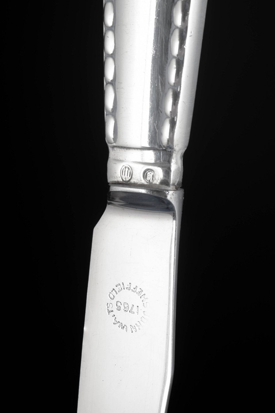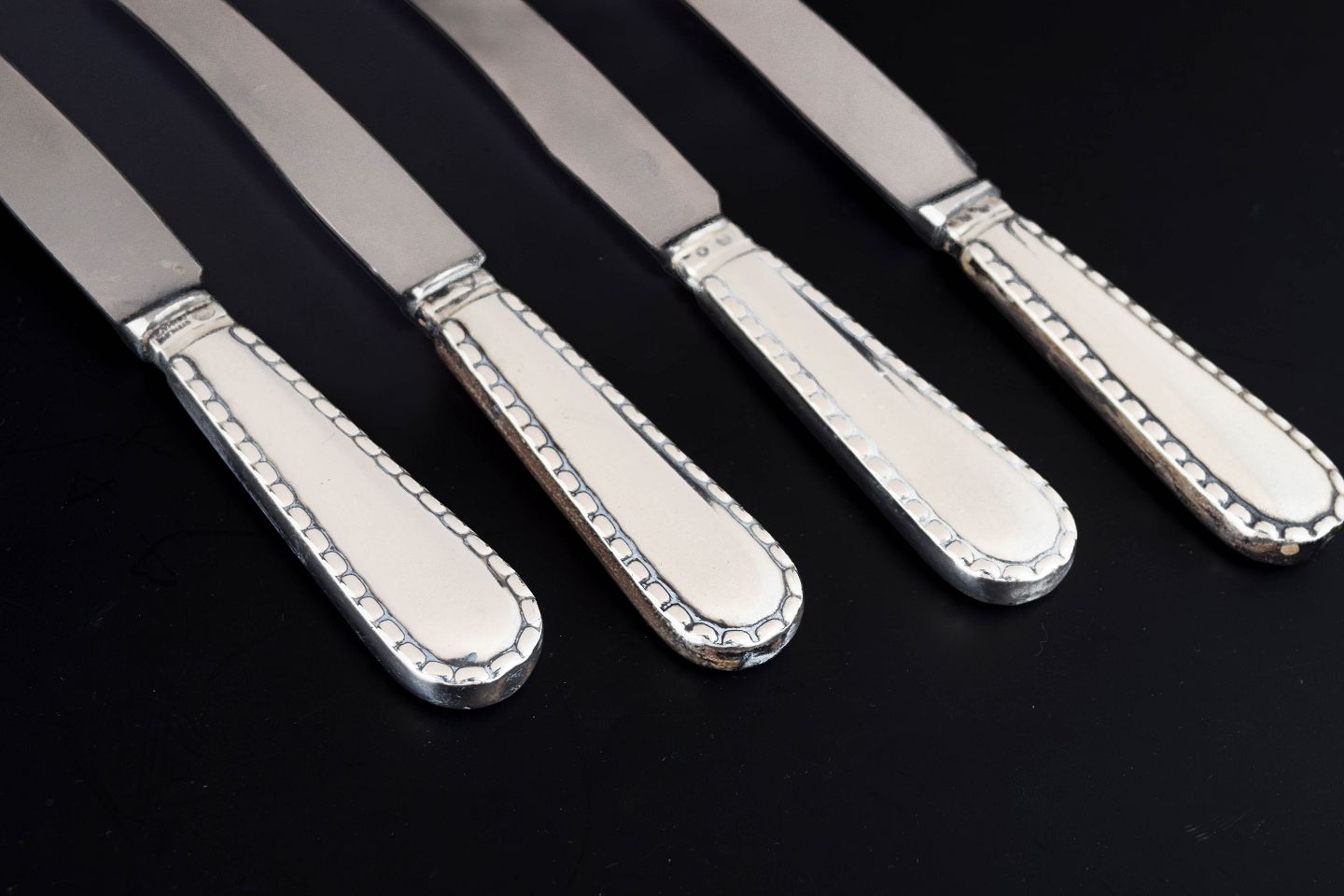 Sæt af fire knive i rustfrit stål og tretårnet sølv i mønstret Perle fra Georg Jensen. Skaftet er udformet med en karakteristisk perlerand langs kanten, et klassisk dekorativt motiv som giver bestikket et elegant og tidløst udtryk.