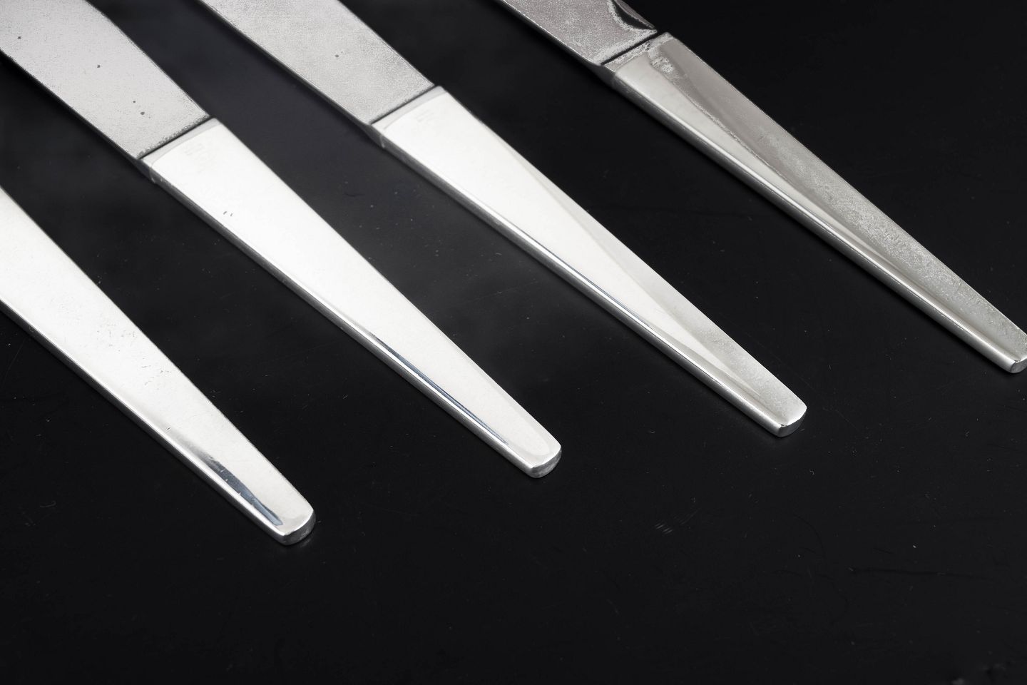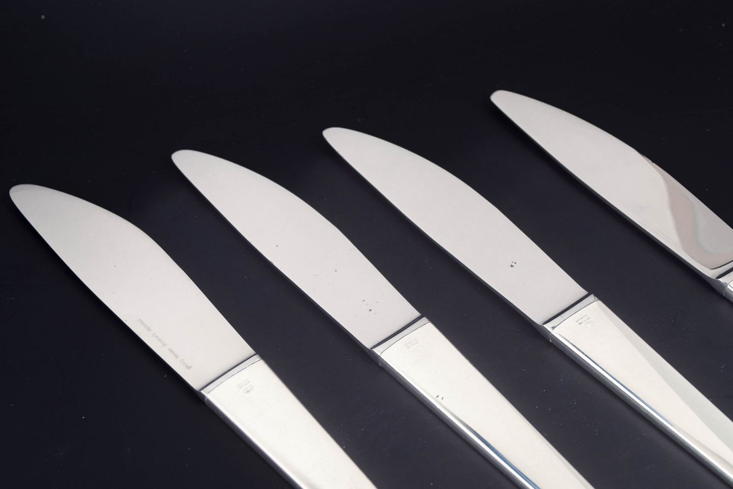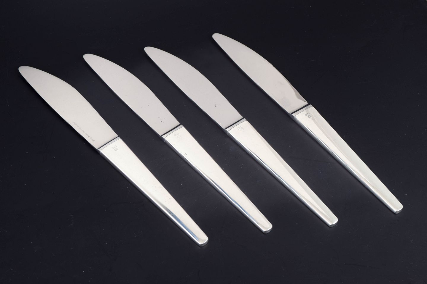 Sæt af fire middagsknive i rustfrit stål og sterlingsølv i modellen Caravel, designet af Henning Koppel for Georg Jensen. Bestikket er udført i et rent og moderne formsprog med slanke linjer og let konisk form, karakteristisk for Koppels funktionalistiske design.