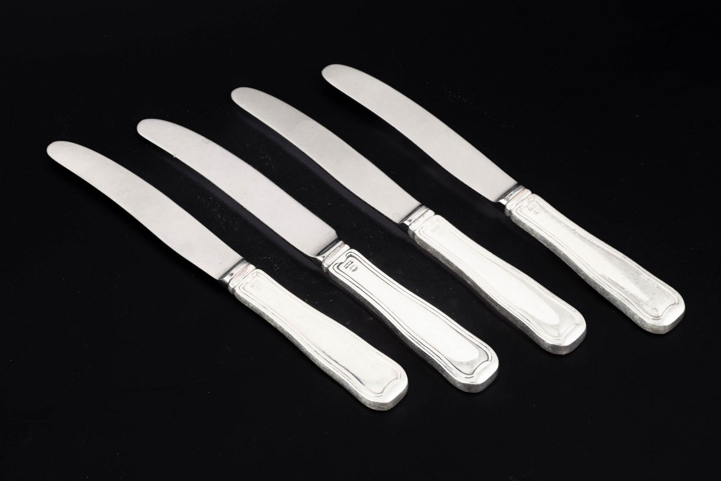 Sæt af fire frugtknive i rustfrit stål og sterlingsølv med skaft i mønstret Dobbeltriflet. Knivene har slanke blade i rustfrit stål og elegante sølvskaft med de karakteristiske parallelle rifler langs kanten, et klassisk design fra Georg Jensen.