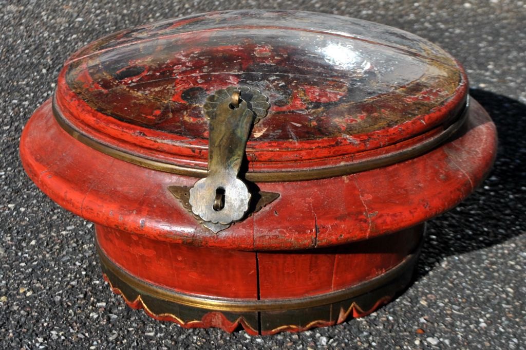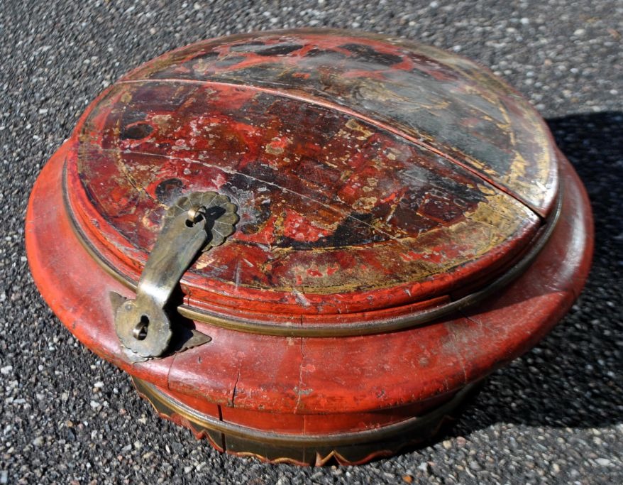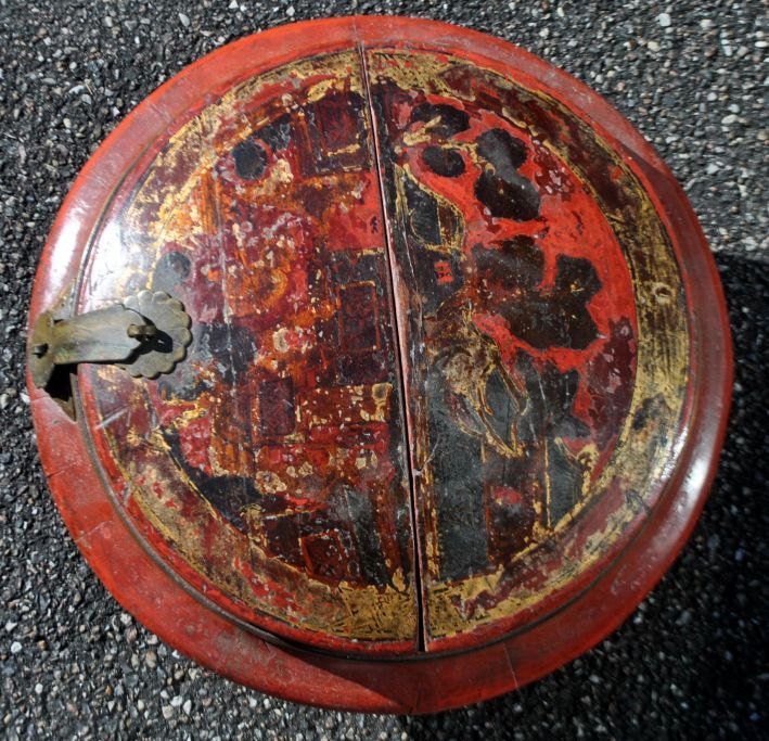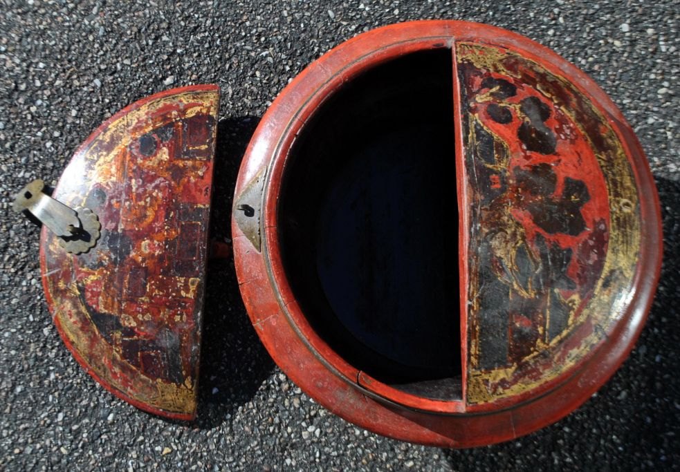 Chinese container in lacquered wood, 19th century. Red lacquered wood with gilding. Brass fittings. Half of the lid can be completely removed. H: 19 cm. Dia: 35 cm.