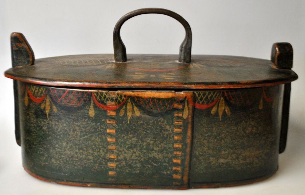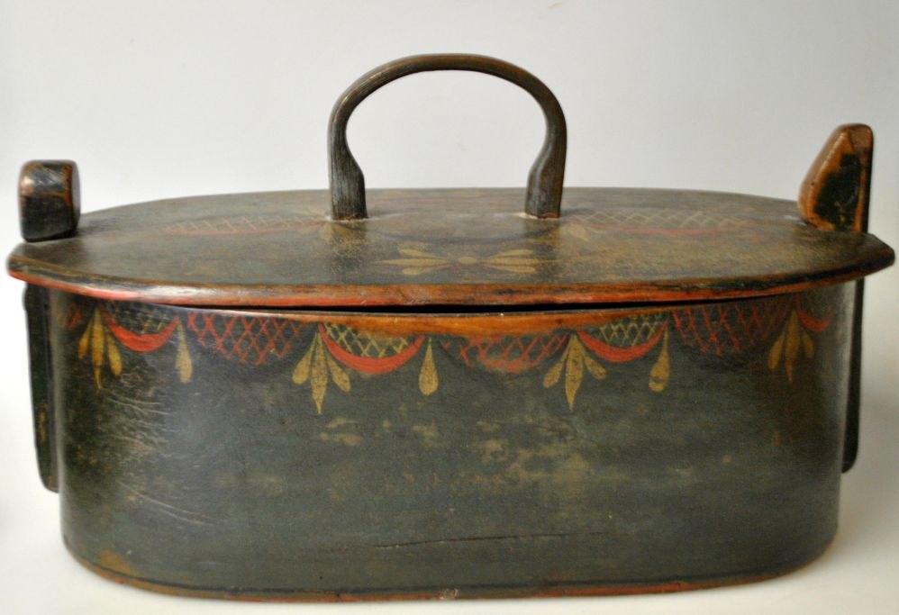 Tejne madkasse i træ med låg, ca. 1820-1830, Danmark. Bemalet i grøn med rød og gylden dekoration. H. inkl. hank: 19,5 cm. L: 34 cm. B: 18 cm.