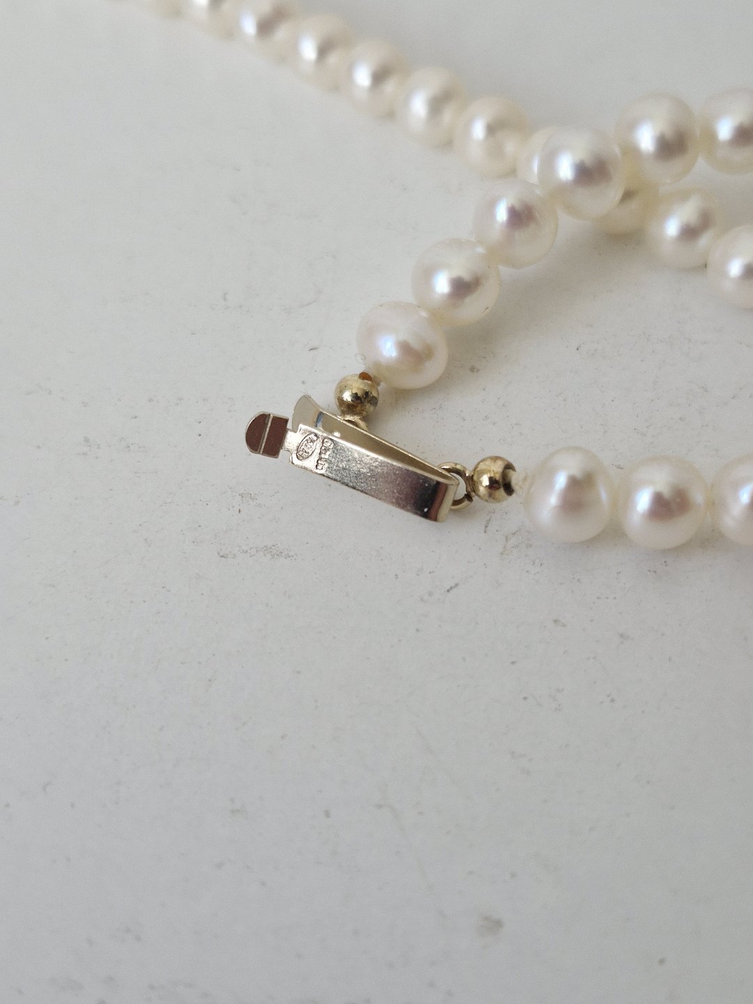 Længde 42 cm. Diameter på perlerne 5,7 mm.