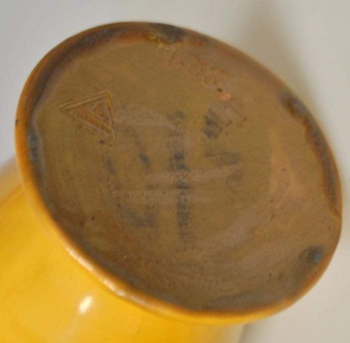 Keramisk vase, Annashåb Lervarefabrik, 1930'erne. Egebjerg ved Horsens, Danmark. No. 608.  Gul og brunglaseret. Stemplet. H.: 24,5 cm.