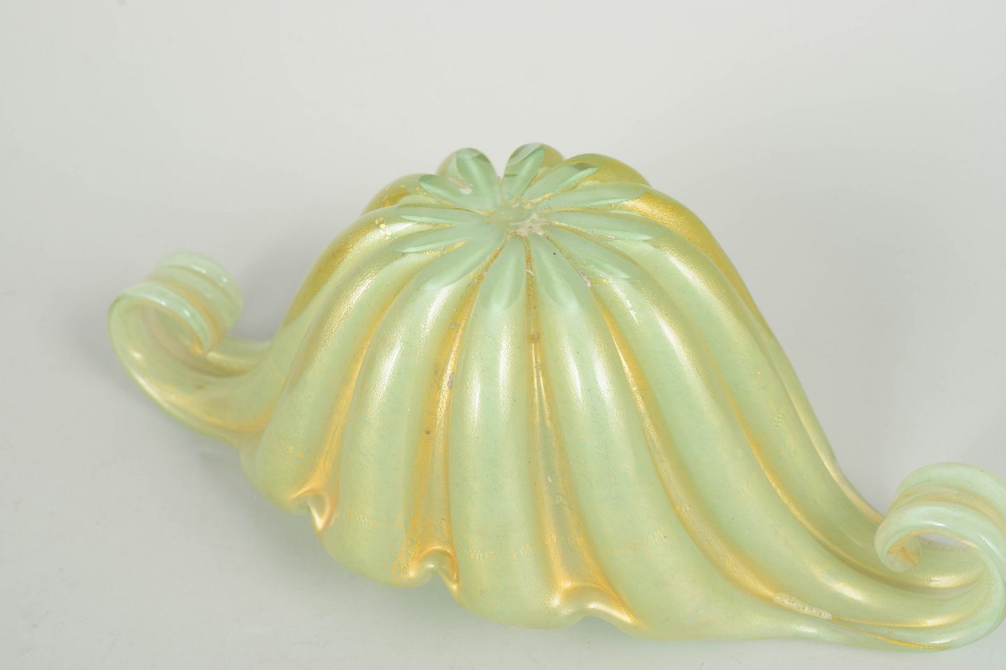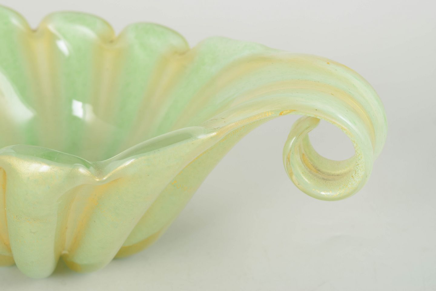 Dekorativ kunstglasskål i iriserende glas med bølgende korpus og elegante opadbøjede ender, udført i karakteristisk Murano-stil med bløde former og lysreflekterende overflade.
