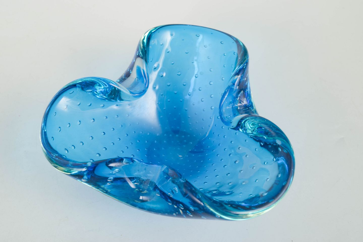 Organisk formet glasskål i klart blåt glas med indkapslede luftbobler og blødt bølgende rand, udført i den karakteristiske italienske kunstglasstil fra Murano.