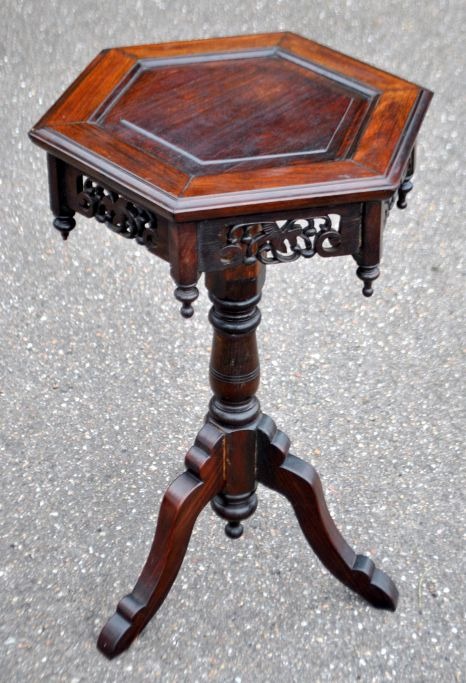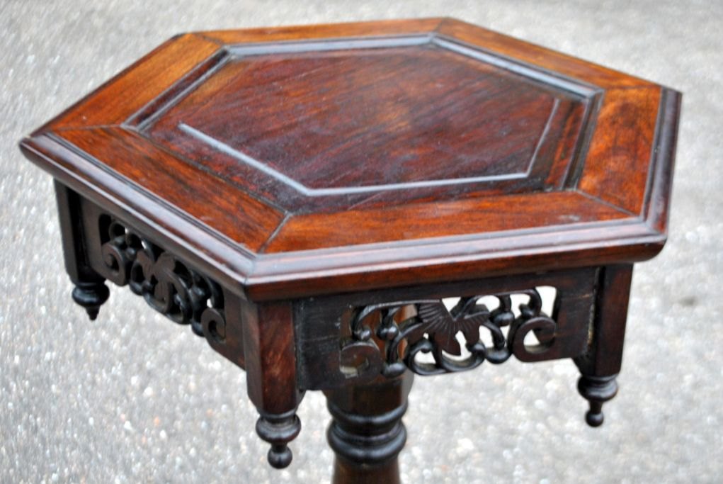 Sekskantet sidebord, 19. årh. Kina. Mahogni. På tre ben med udskæringer. H: 58,5 cm. B: 39 cm.
