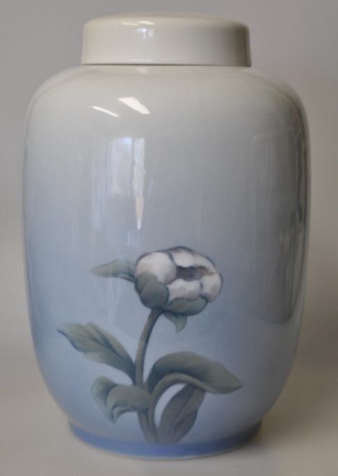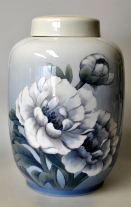 Lågkrukke i porcelæn, Royal Copenhagen no. 92/888, 20. årh. København, Danmark. Dekoreret med pæoner. Stemplet. H: 25 cm. Dia: 17 cm.