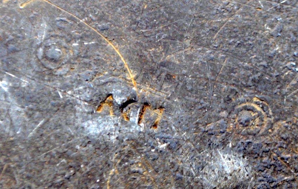 Stort tin fad, 18. årh. Stemplet.  Med forskellig ejerinitialer. Dia: 42 cm.