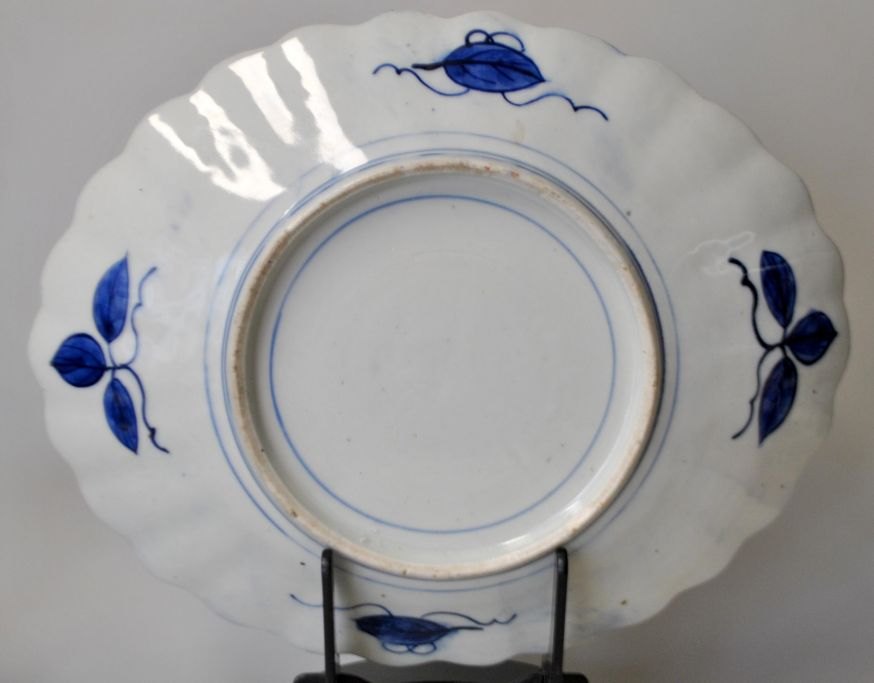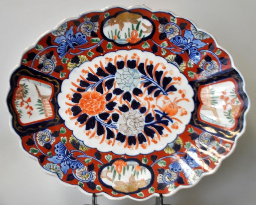 Ovalt Imari fad i porcelæn, 19. årh. Japan. Med bølget rand. Polykrom dekoration med blomster og fisk. Delvis i transfer teknik. H: 25 cm. L: 31 cm.