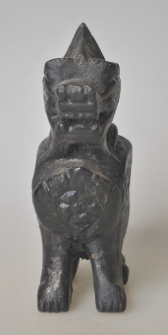 Kinesisk udskåret træfigur af løve, 19. årh. Sortbemalet. H.: 12 cm.