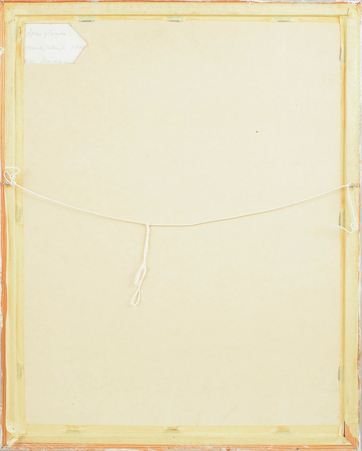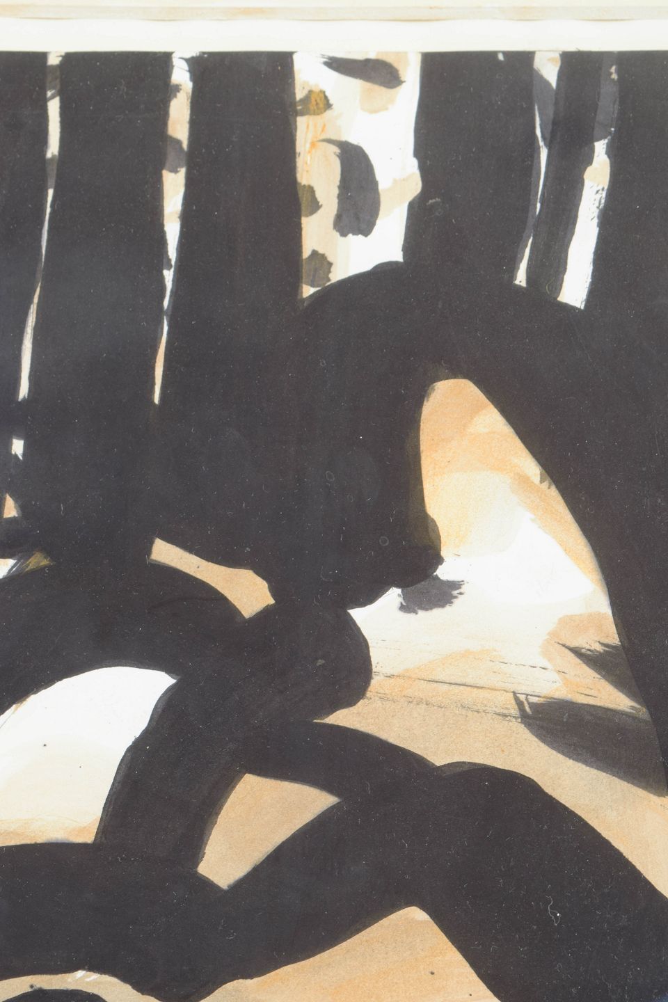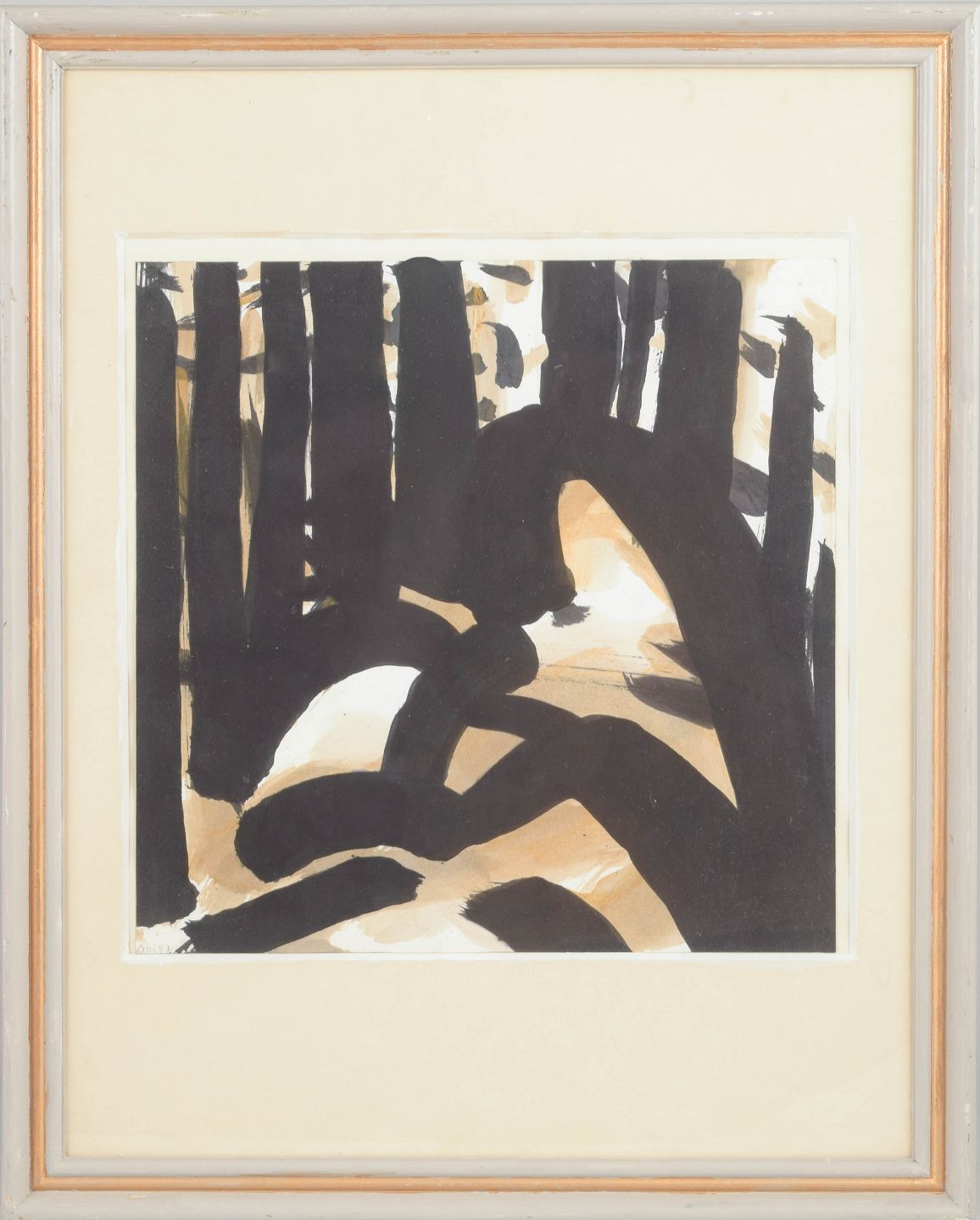 Abstract composition with bold black brushstrokes and organic forms executed in mixed media on paper. The work titled “Ljus glänta” is signed and dated 1987.