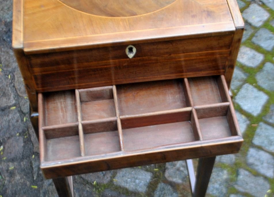 Empire sybord, 19. årh. Danmark. Med intarsia. Med oplukkelig og aflåselig plade, hvorunder der er mindre rum. Yderligere en skuffe med rum. På tilspidsede ben. H.: 75 cm. B.: 30 cm. D.: 30 cm.