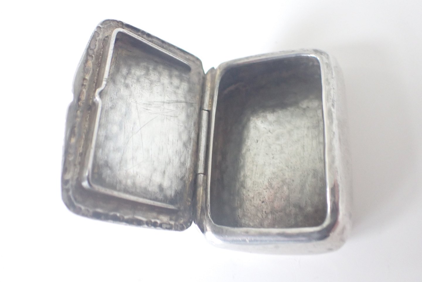 Æske bagerst: Firkantet pilleæske/tabatiere i tysk sølv med punslet dekorationer på forside, bagside og kanter. Tidlig 1800-tal. Vægt: 20,3 gram. Højde: 2,1 cm. bredde: 4,5 cm. I fin stand i forhold til alder. Pris: 600 kr.