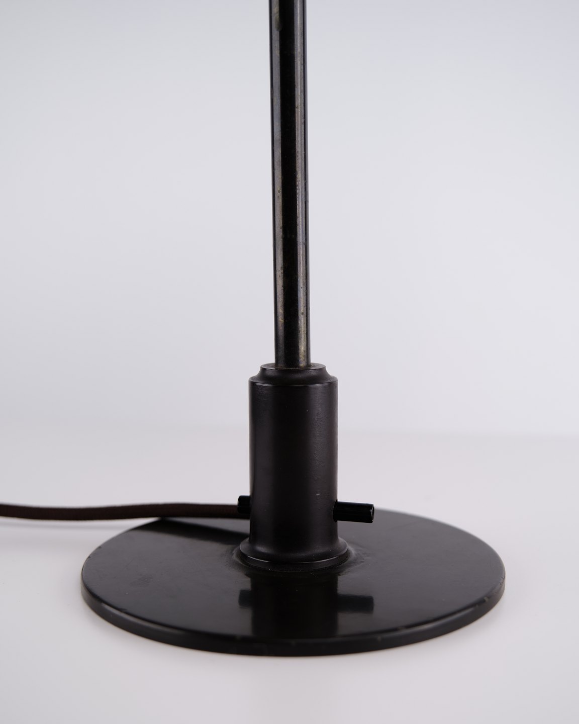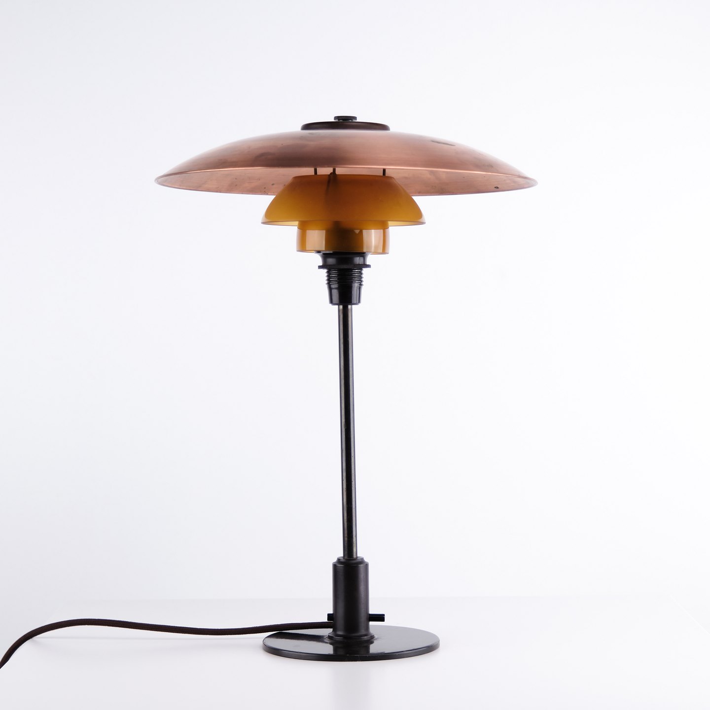 PH 3,5/2 bordlampe designet af Poul Henningsen og fremstillet af Louis Poulsen i 1930’erne. Lampen er udført med overskærm i kobber, ravfarvede glasskærme og fod i bruneret messing.