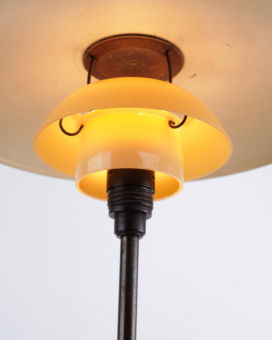 Sjælden PH 3,5/2,5 bordlampe designet af Poul Henningsen og fremstillet af Louis Poulsen i 1930’erne. Lampen har gulmalet metaloverskærm med stel i bruneret messing samt mellem- og bundskærme i 1-lags gulmalet opalglas.