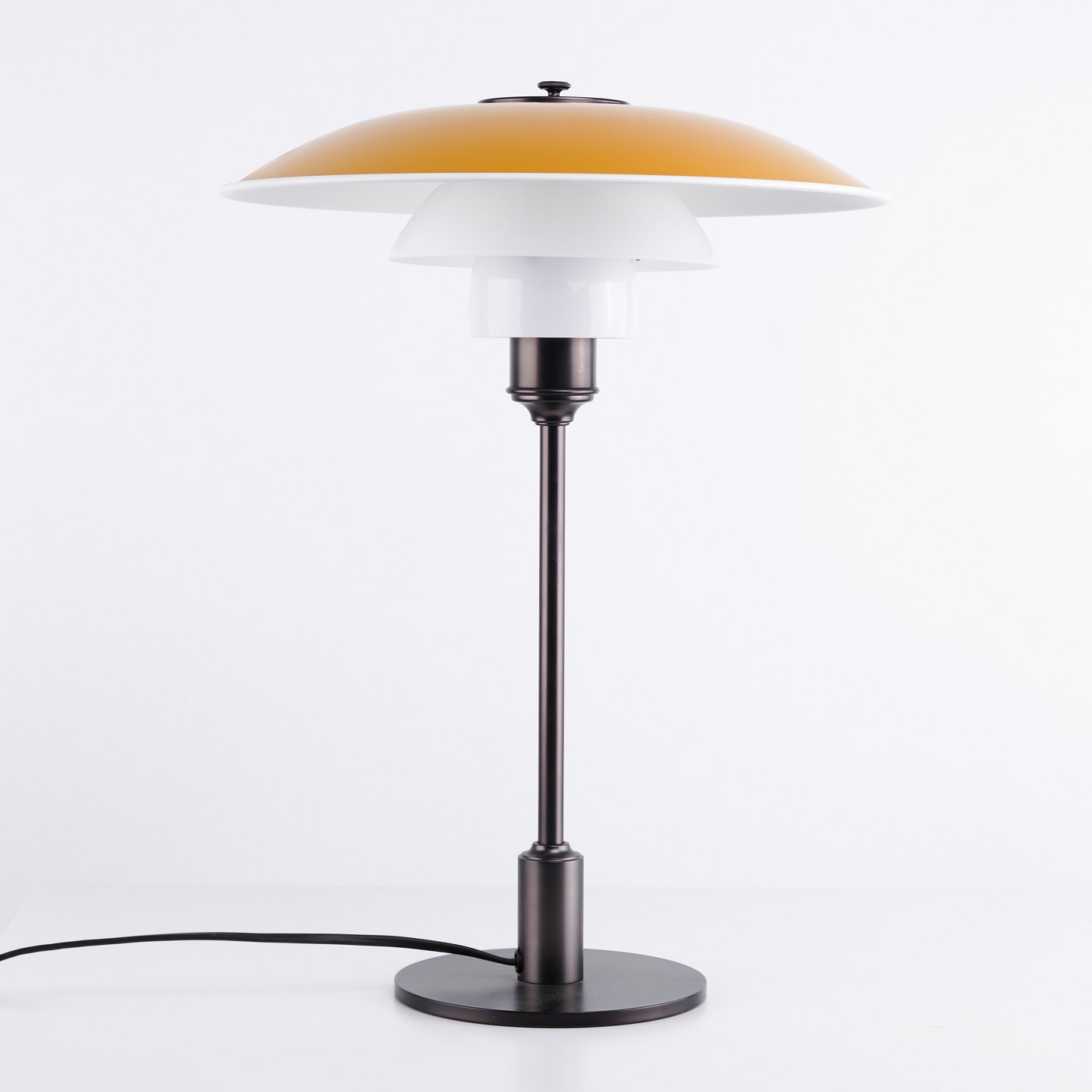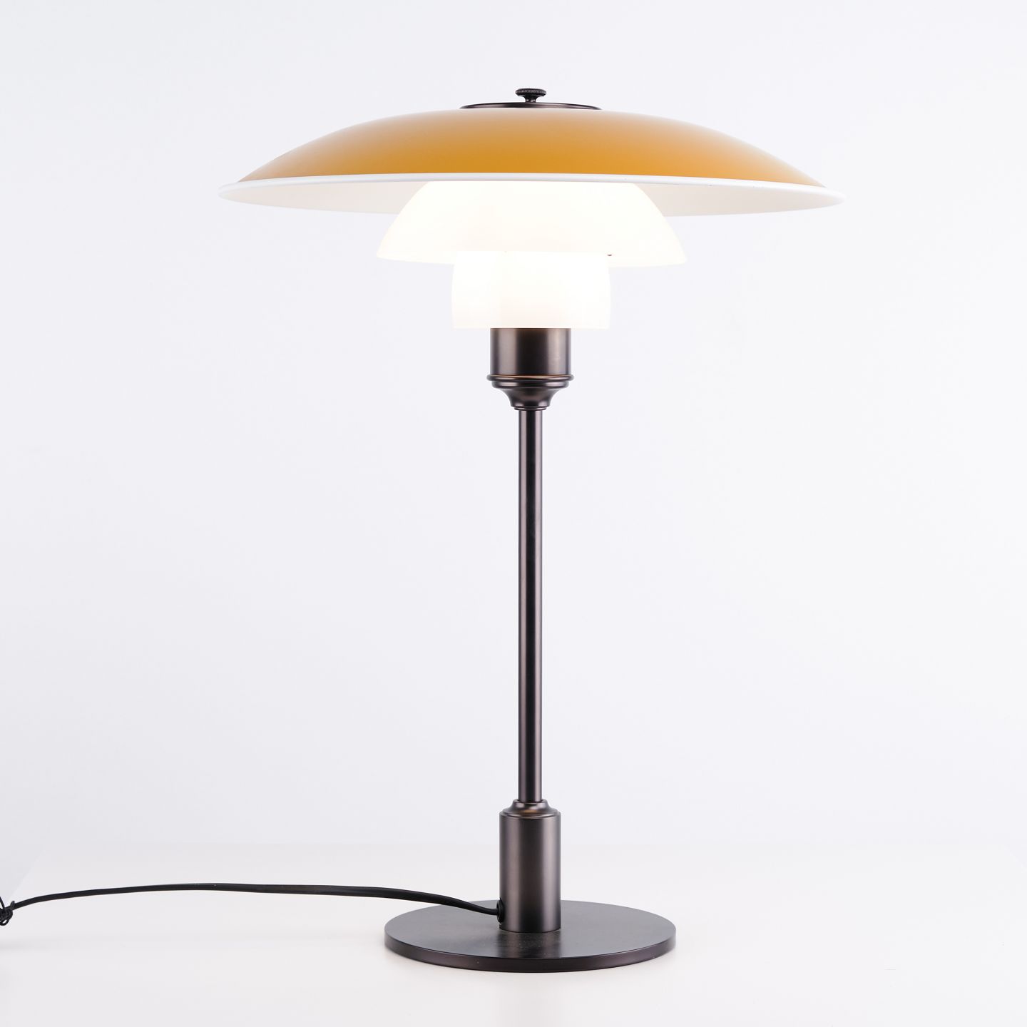 PH 3½-2½ bordlampe fra Louis Poulsen designet af Poul Henningsen i gul metal og bruneret messing. Klassisk dansk belysningsdesign.