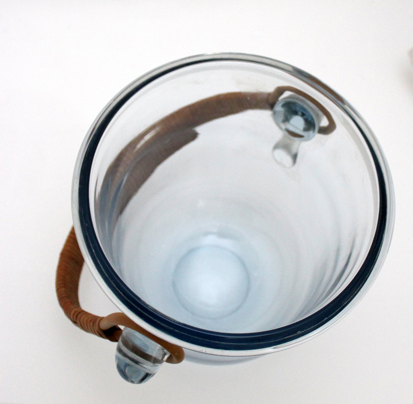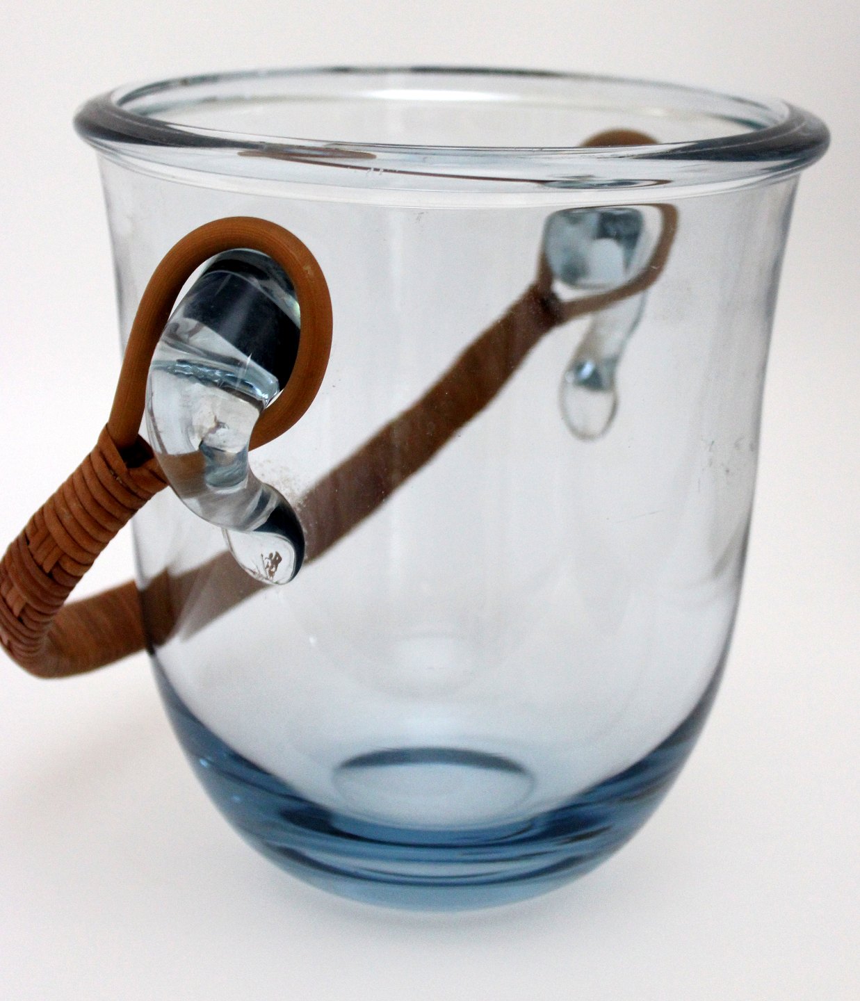 Holmegaard, Champagnekøler, stor isspand i transparent aquablå kraftigt glas med basthank. Designet af Jacob E. Bang i 1934. Ingen signatur. Højde 19,5 cm. Øverste diameter 18 cm. Vægt 2 kg. God stand men fremstår med ridser midt på. Pris: 675 kr. stk. Lager: 1