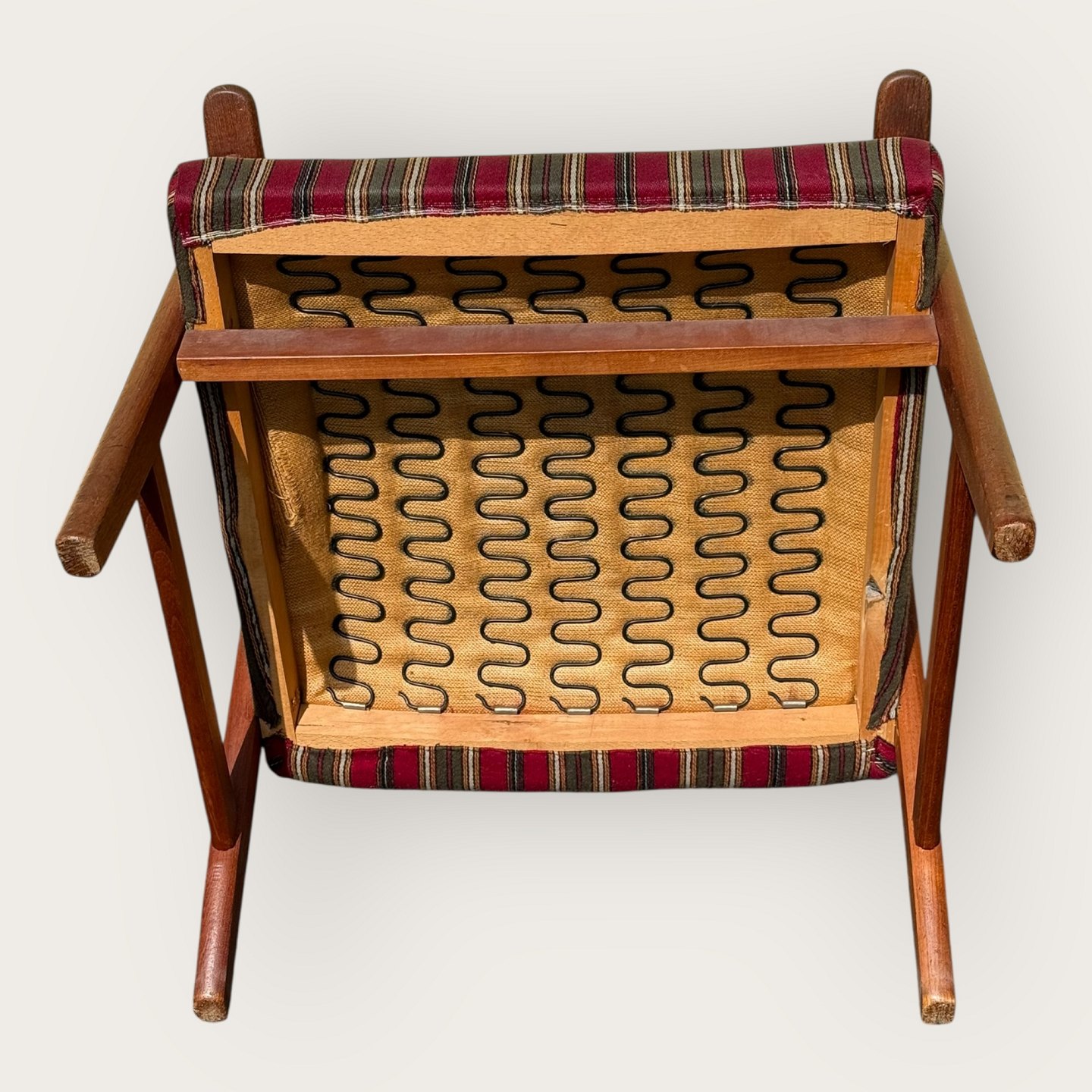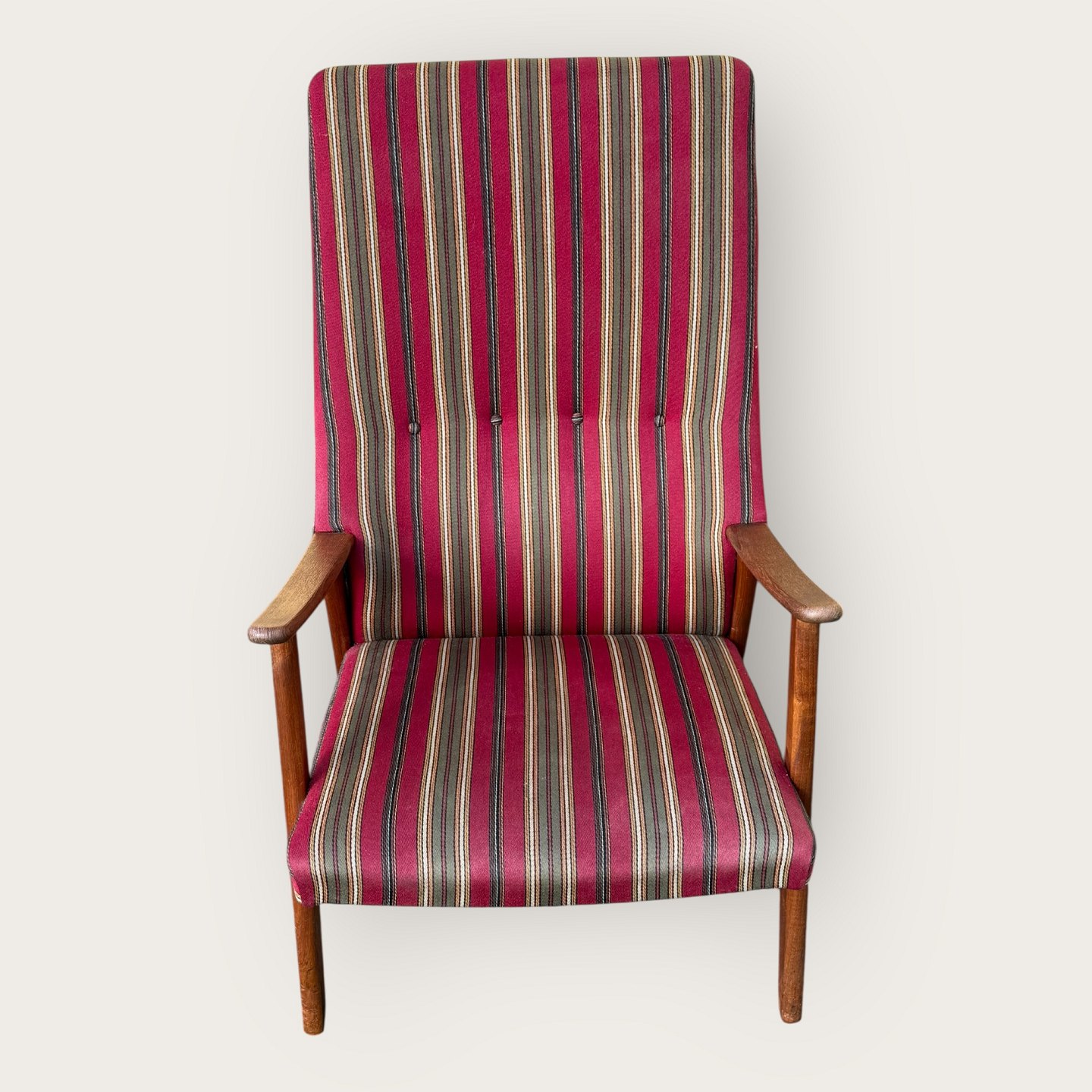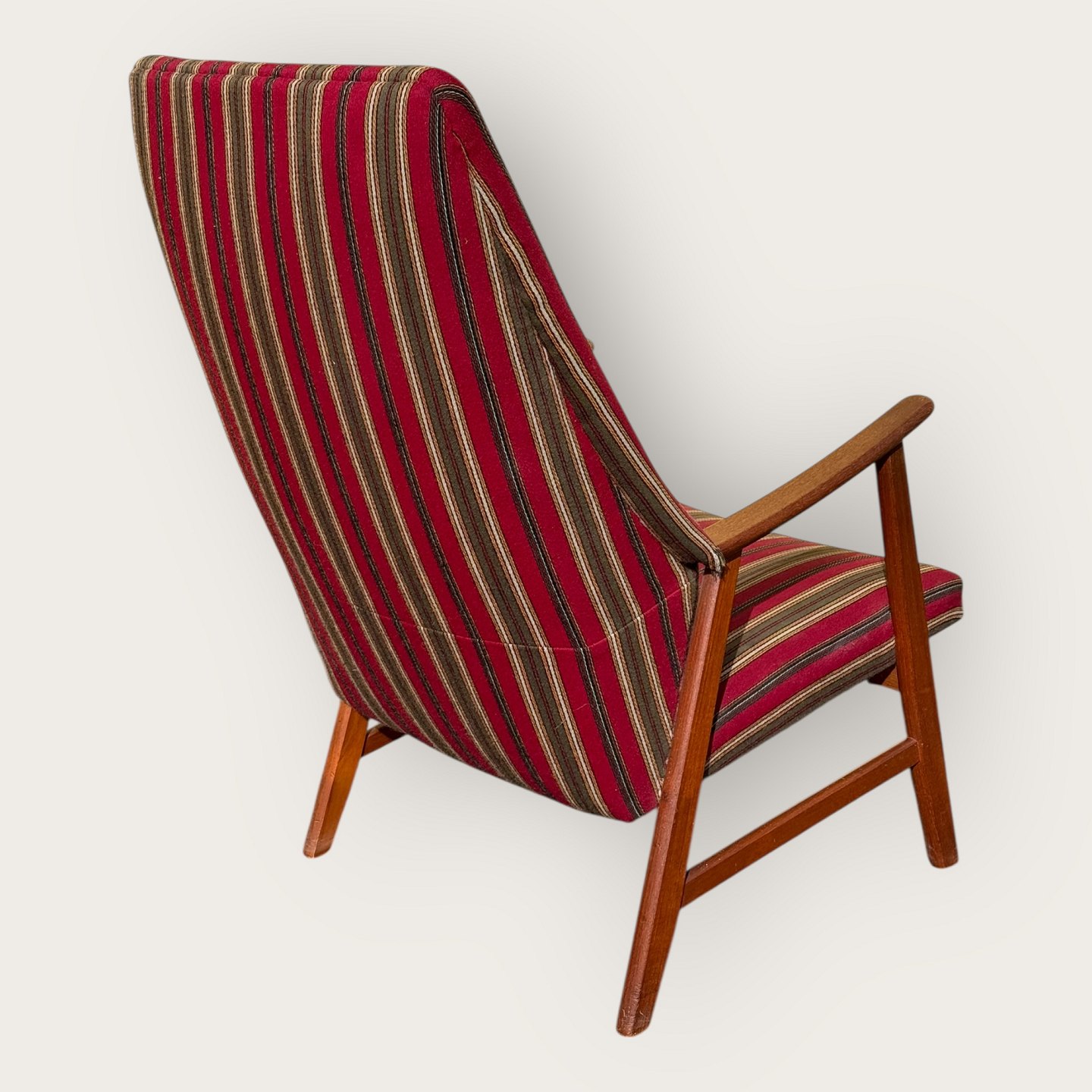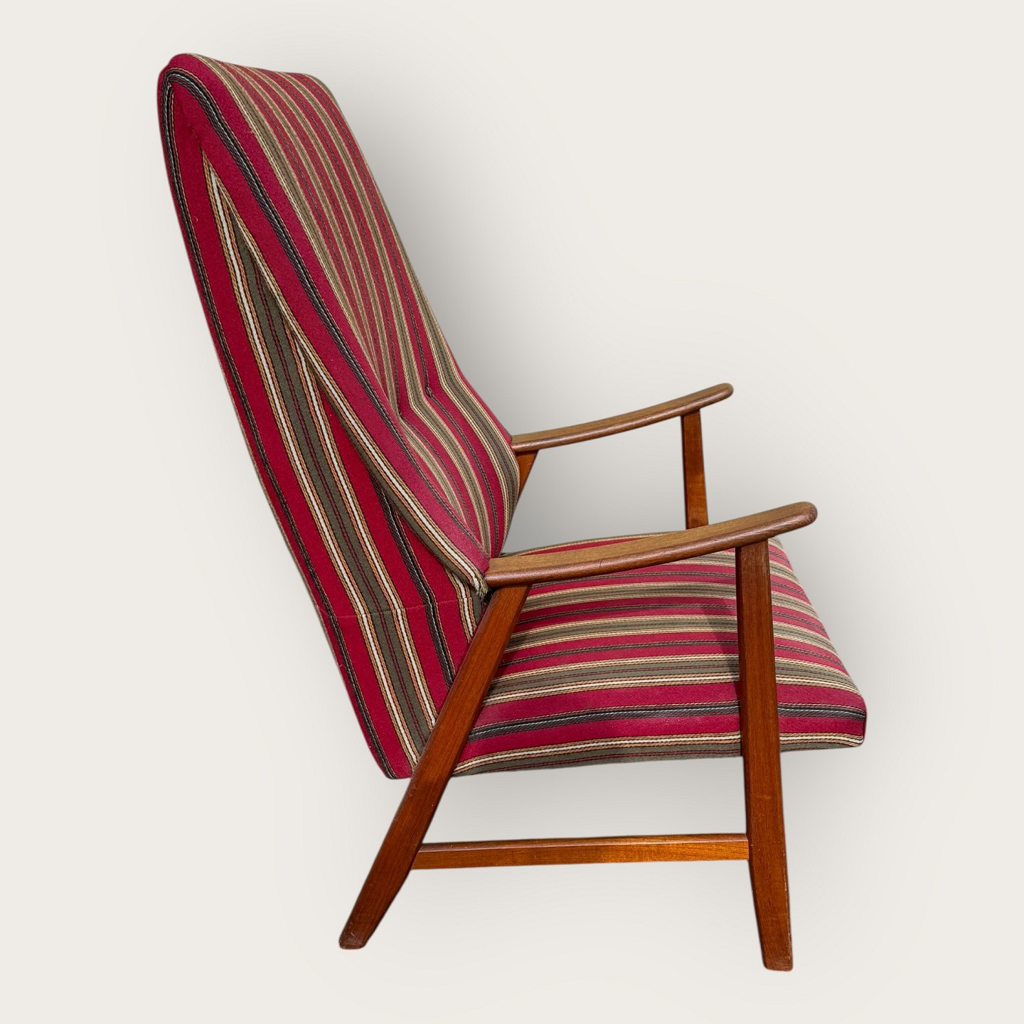 Lænestol i teaktræ og stof, sædehøjde 36cm, bredde 62cm, ryglæn højde 103cm, scandinavian modern fra 1960'erne *pæn stand*