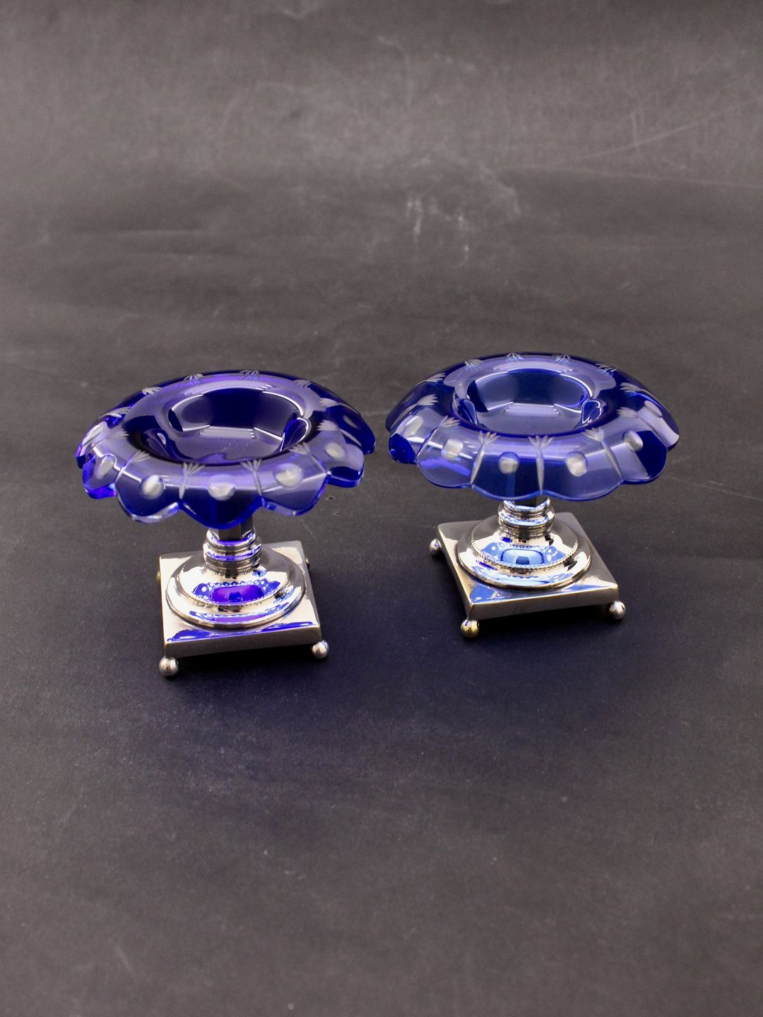 Et par saltkar i blåt glas med forsølvet fod D. 10 cm. emne nr. 634269