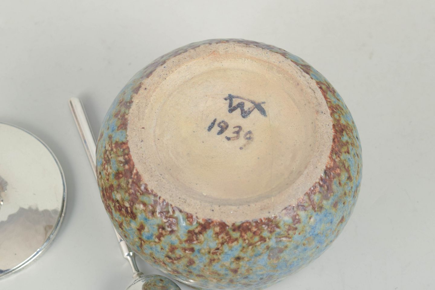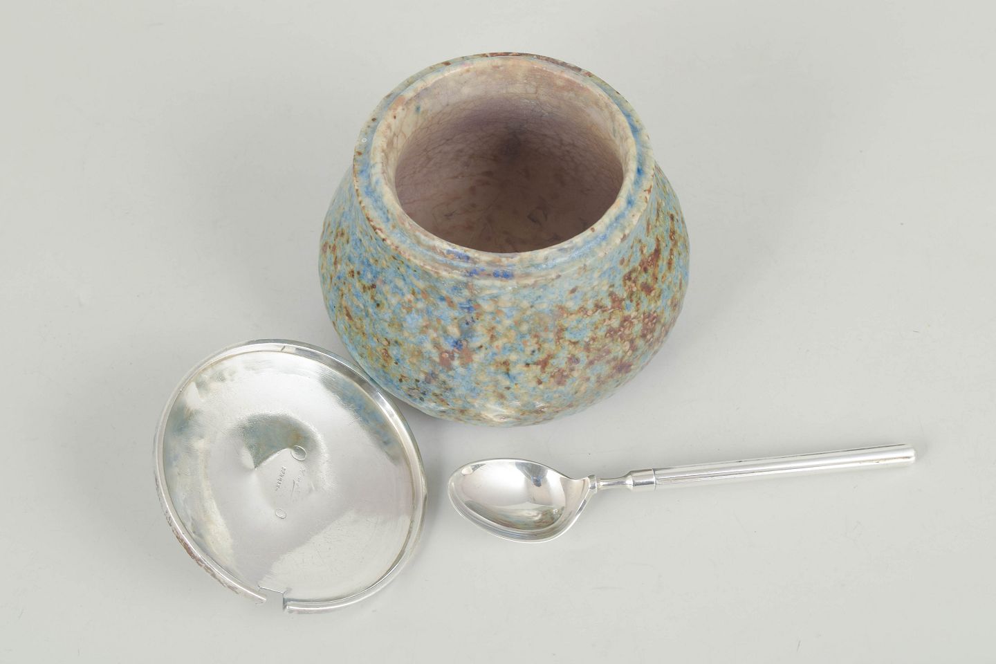 Hand-thrown stoneware jar with a rounded, slightly bulbous form and a multicoloured glaze in blue, green and brown tones. Fitted with a sterling silver lid and spoon by Hans Hansen, in an elegant Art Deco design from 1939.