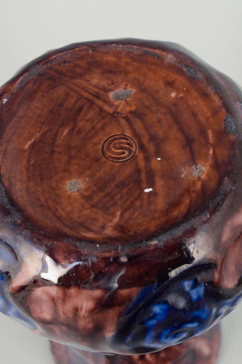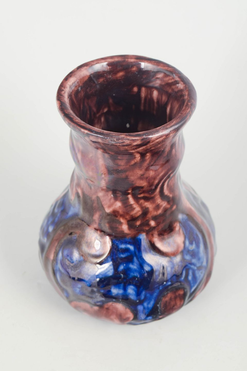 Dekorativ vase i fajance med svungen, organisk form og let indsnævret hals. Udført med den karakteristiske bølledekoration i blå og brun glasur på lys bund. Signeret under bunden.