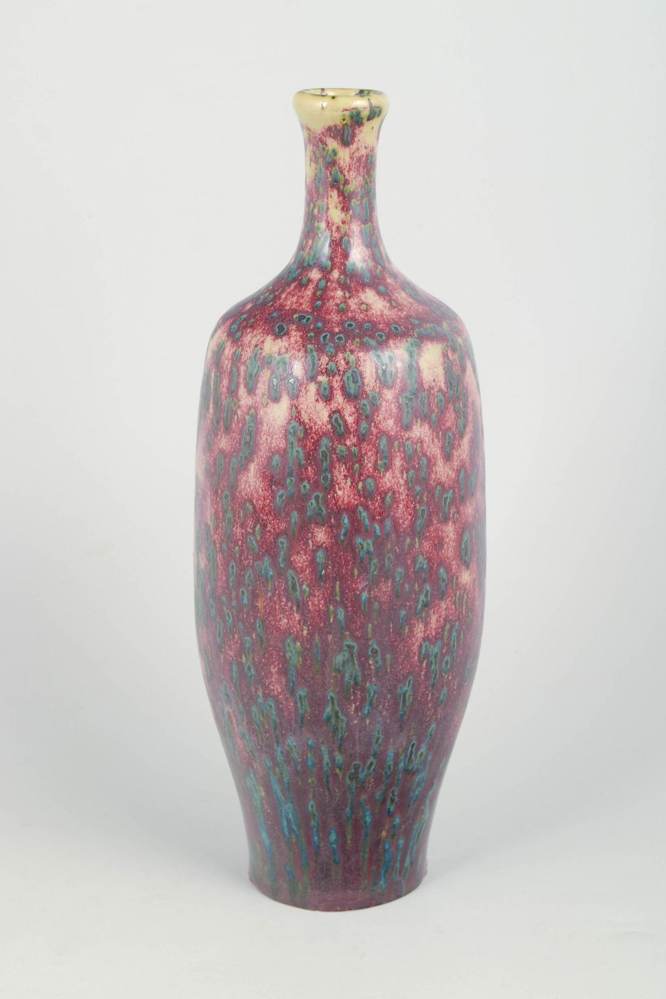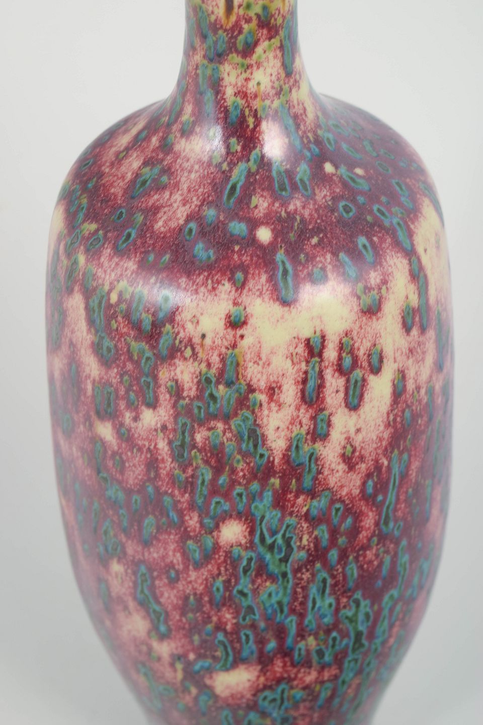 Tall organically shaped ceramic vase with a slender neck and vivid crystalline glaze in pink, violet, and turquoise tones. Unsigned example.