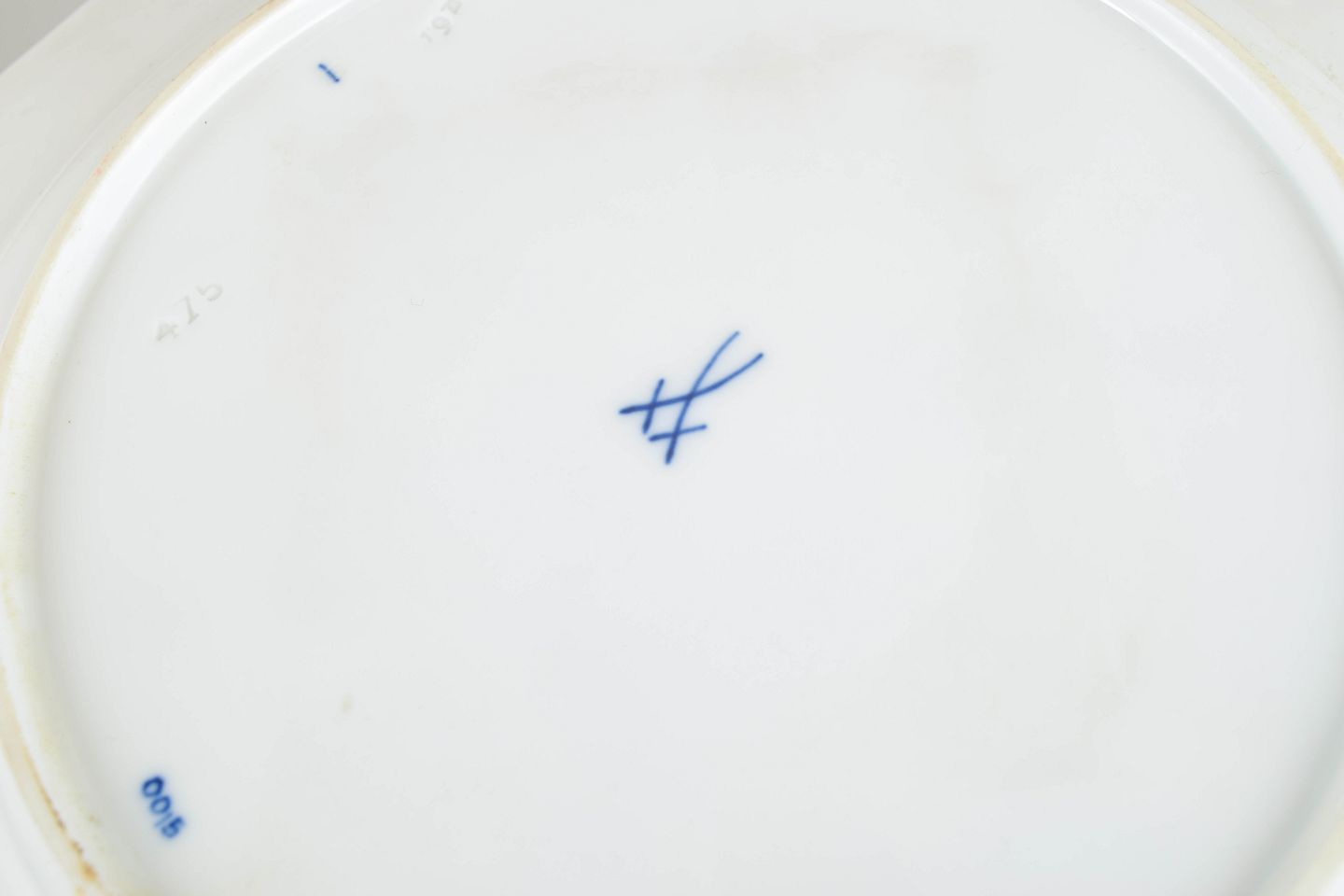 Tre middagstallerkener i porcelæn med håndmalet blå dekoration i det klassiske løgmønster. 1. sortering, fabriksstemplet med Meissens krydssværd. Diameter 24 cm.