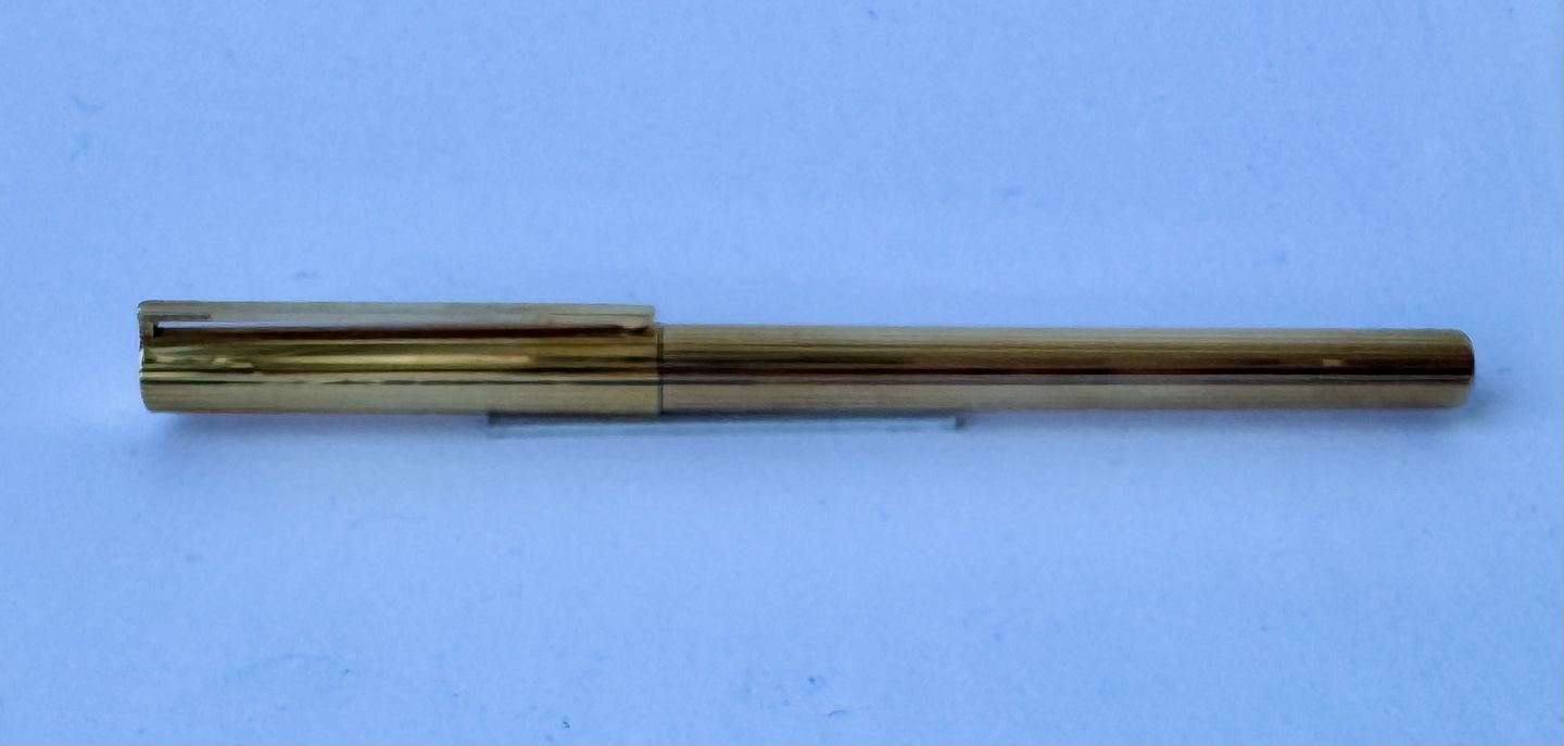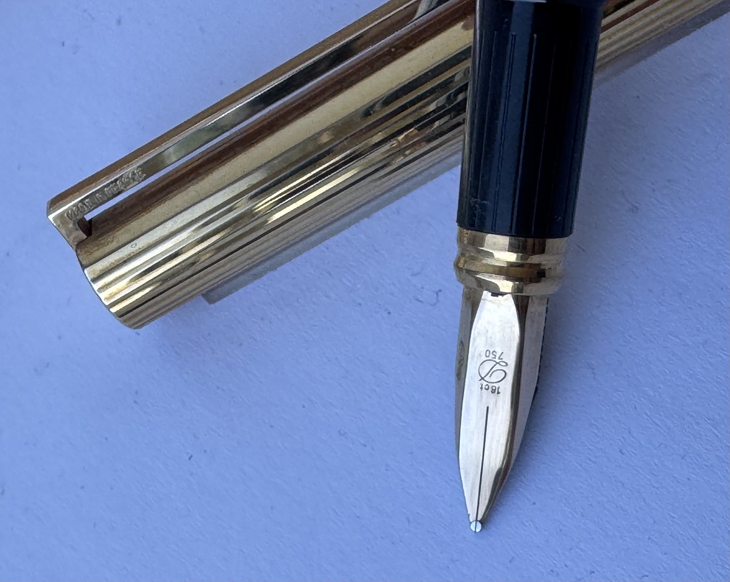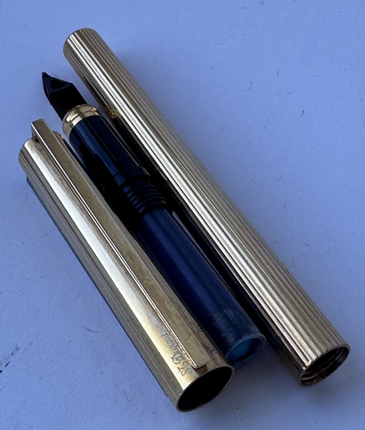 Slank S.T. Dupont De Paris 925 Sterling guld-double fyldepen fremstillet i 1970’erne. Alle dele originale inklusiv en 18 karat guldspids. Fremstår i god og skriveklar stand, når der bliver indsat en ny blæk-patron. Ingen skader eller reparationer .L. 13,9 cm