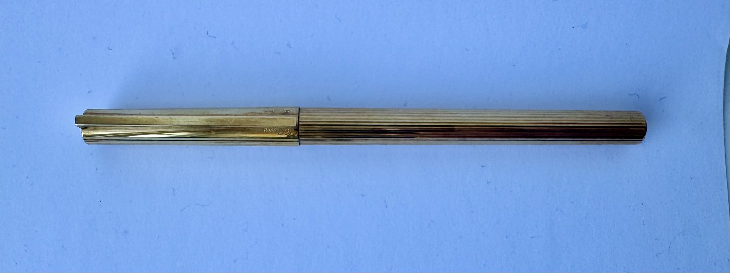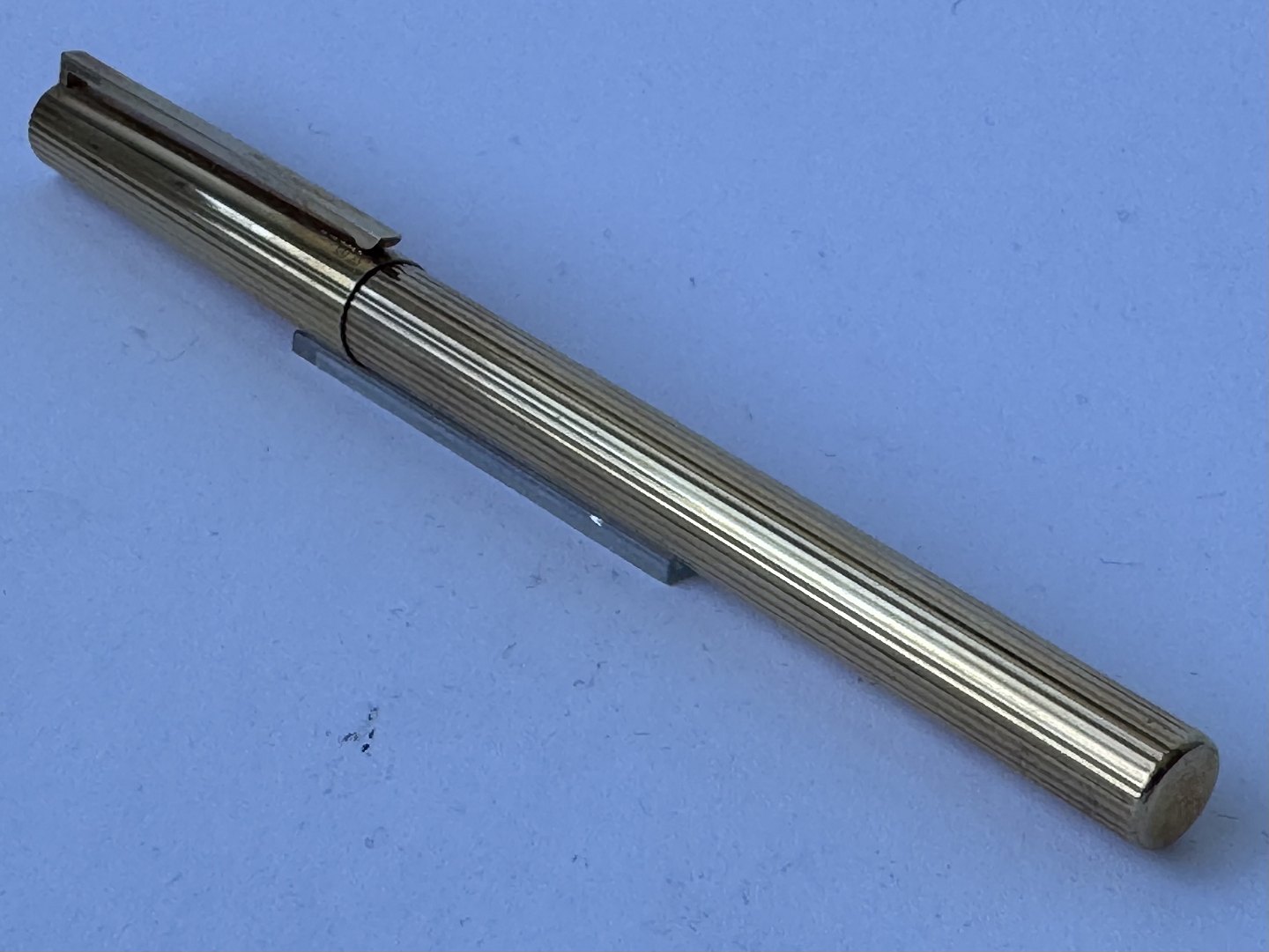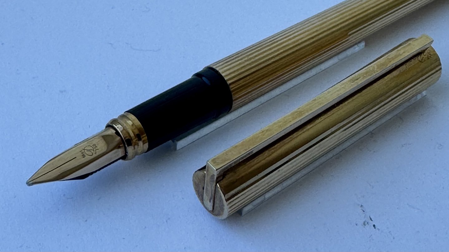 Slank S.T. Dupont De Paris 925 Sterling guld-double fyldepen fremstillet i 1970’erne. Alle dele originale inklusiv en 18 karat guldspids. Fremstår i god og skriveklar stand, når der bliver indsat en ny blæk-patron. Ingen skader eller reparationer .L. 13,9 cm