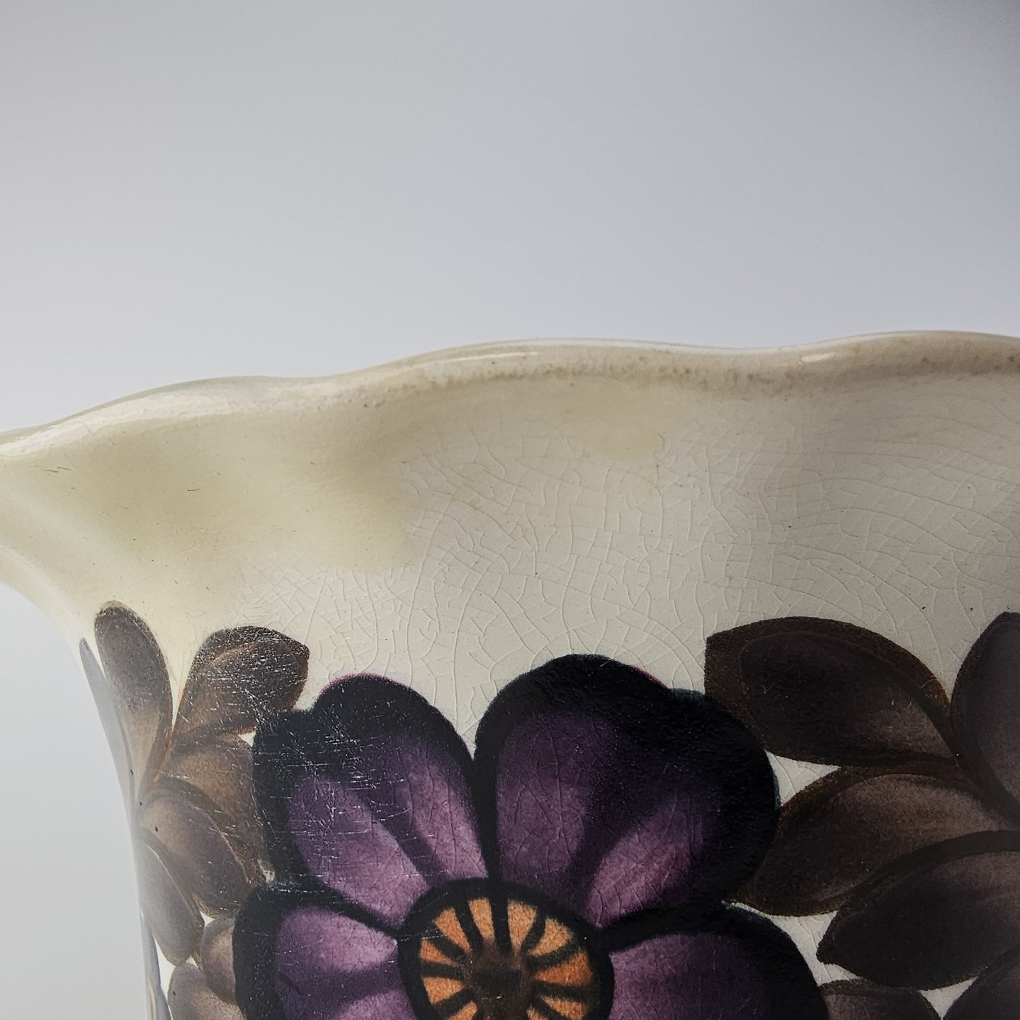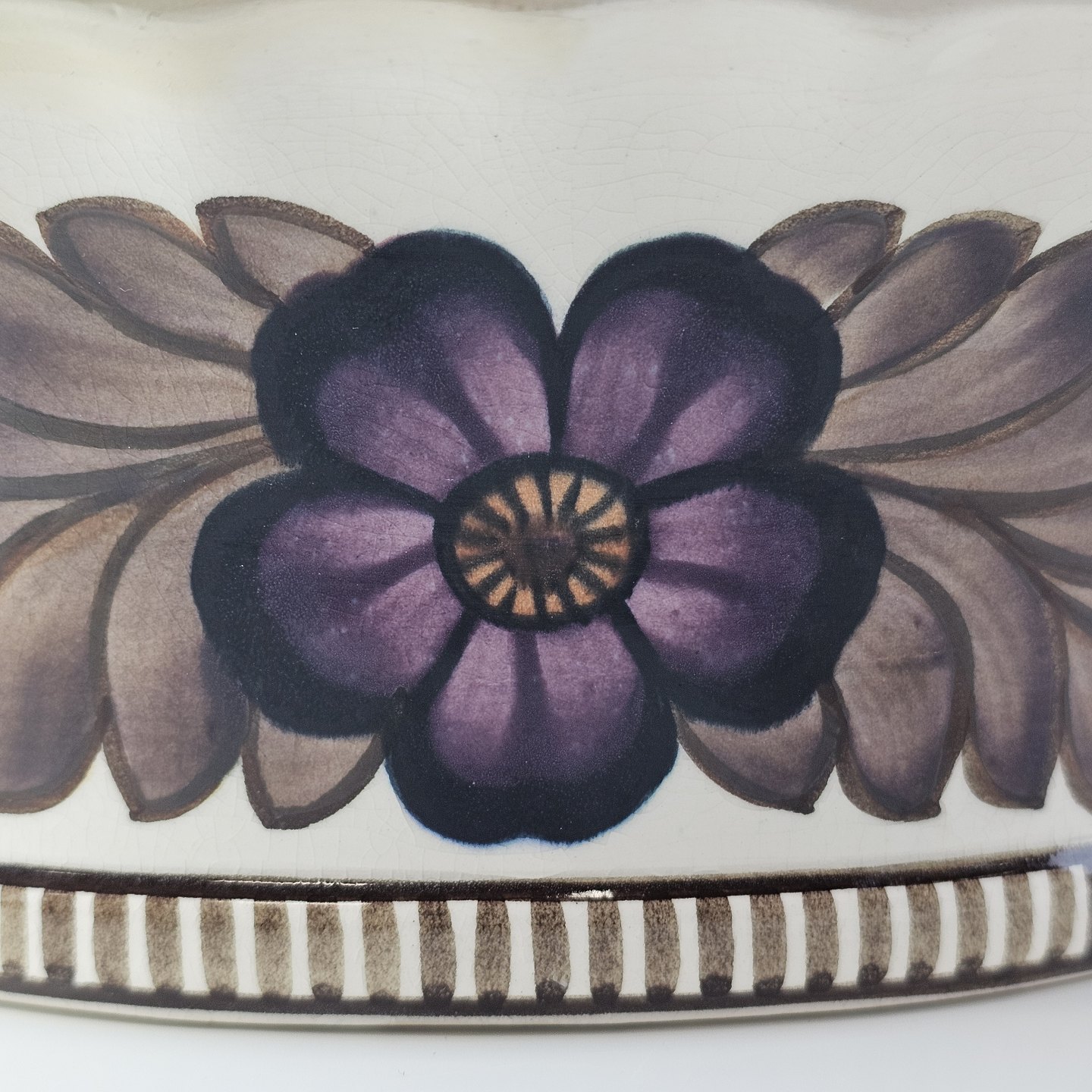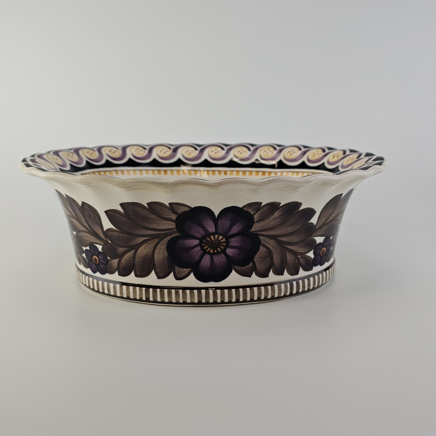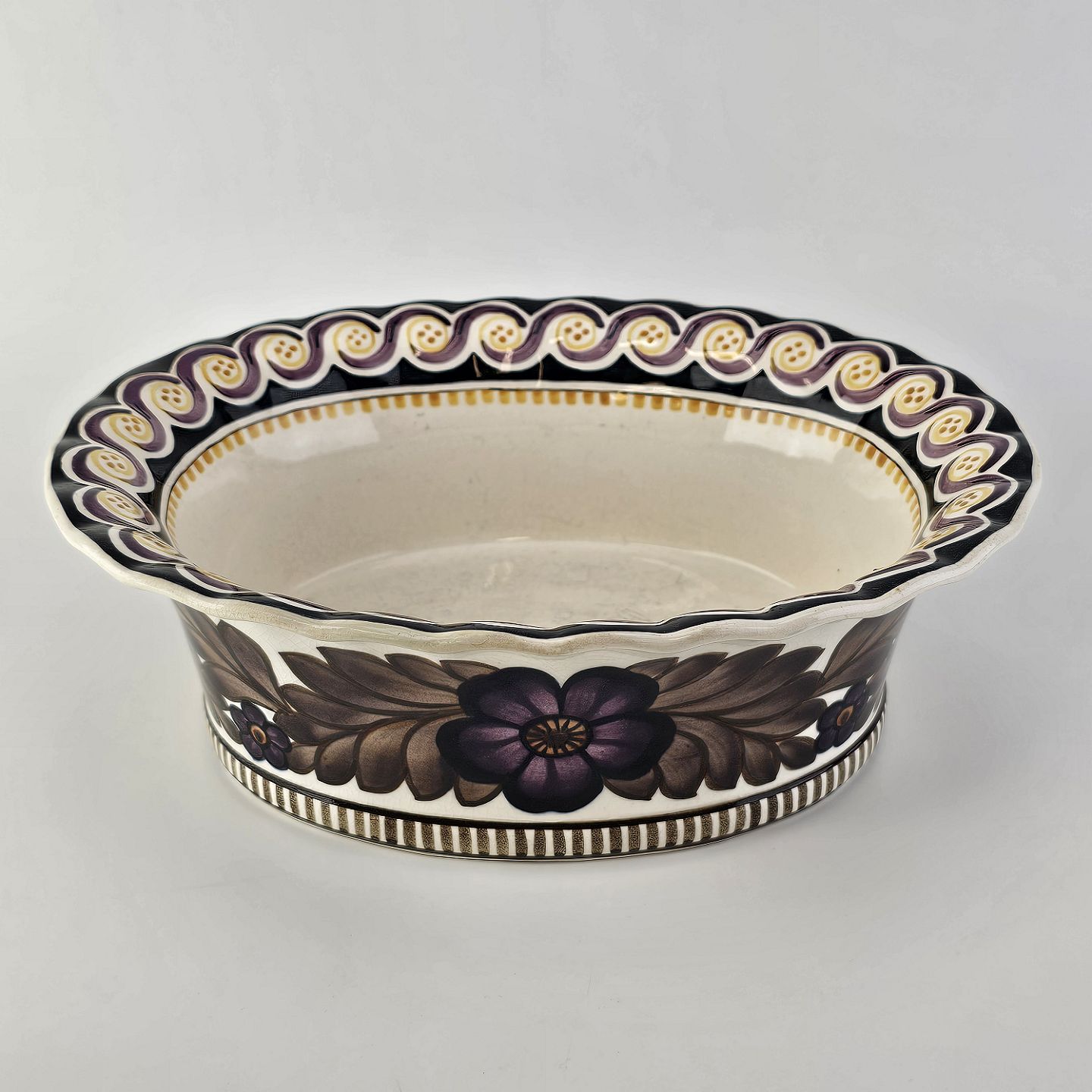 Oval jardiniere i fajance med dekoration af brun og lilla blomster