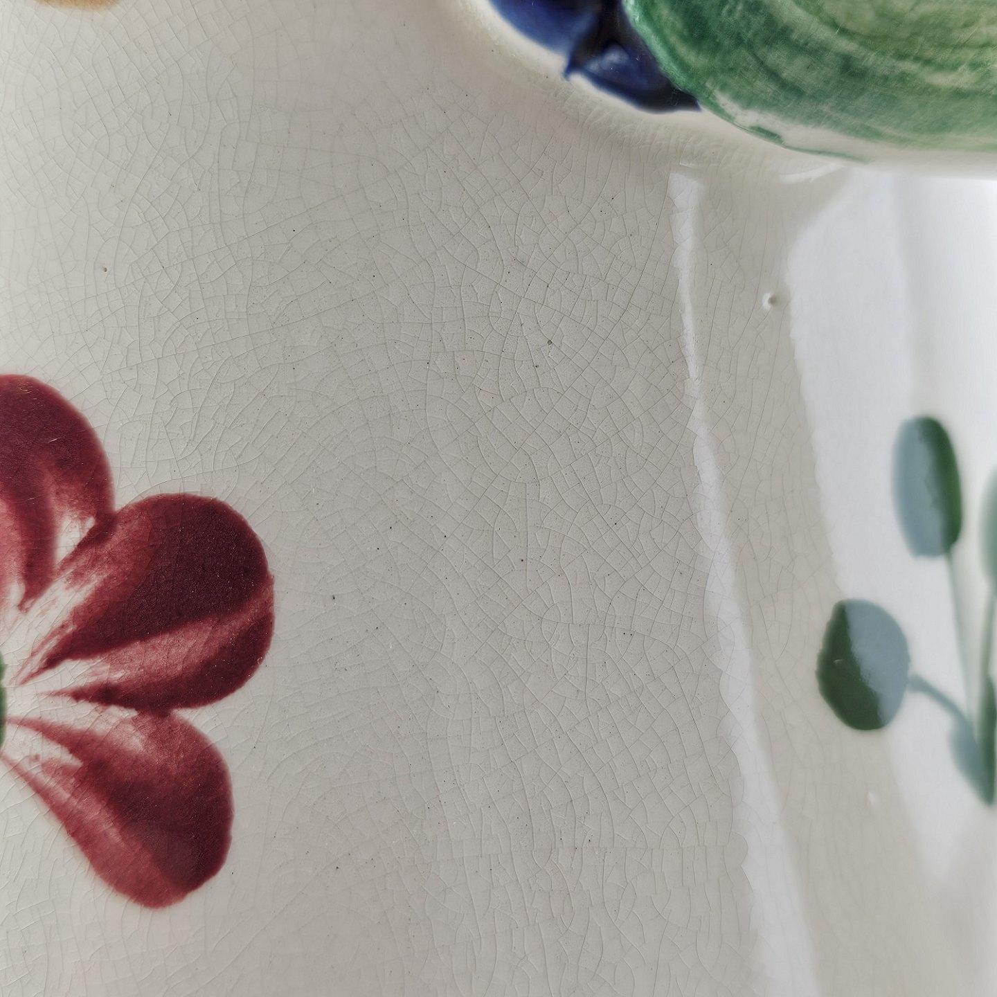 Stellet er i hvid fajance og håndmalet med dekoration af røde blomster