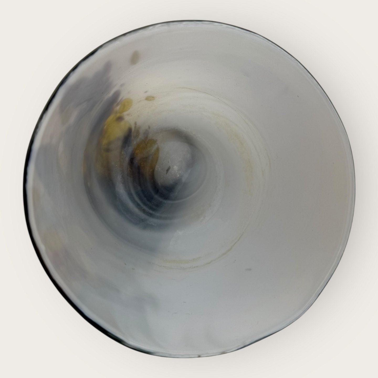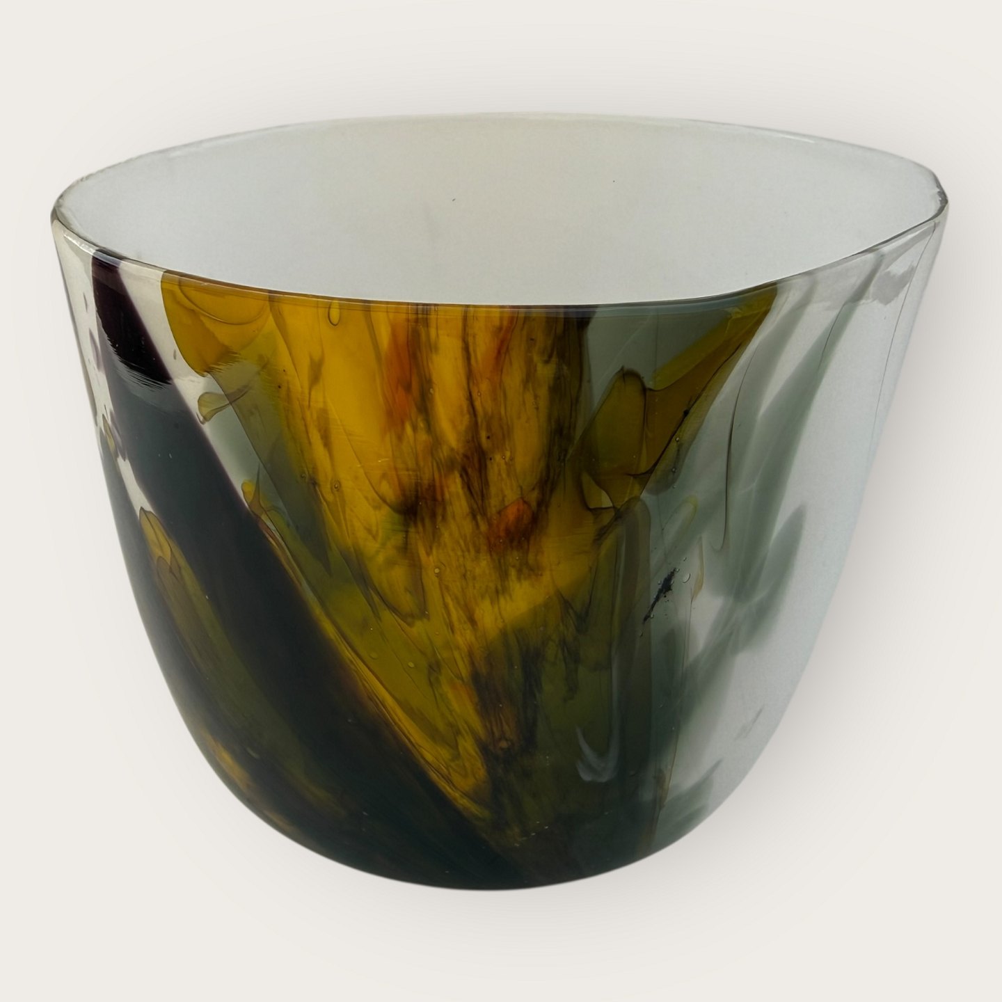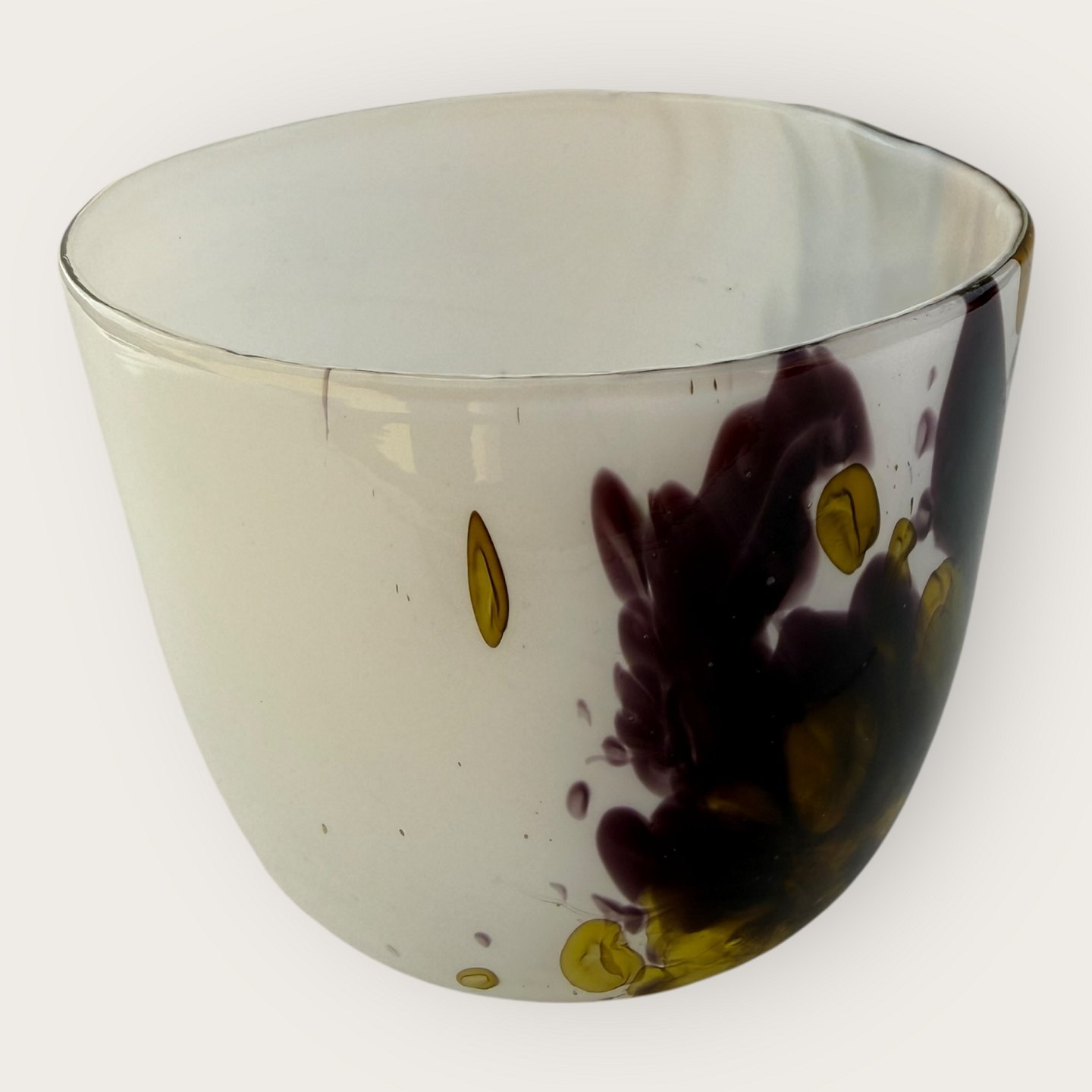 Holmegaard, Cascade, urtepotteskjuler, opalhvidt glas og gult, brunt og lilla, Diameter 16cm, højde 13,5cm, Design Per Lütken, 2. sortering *lidt ujævnheder i kanten ellers pæn stand*