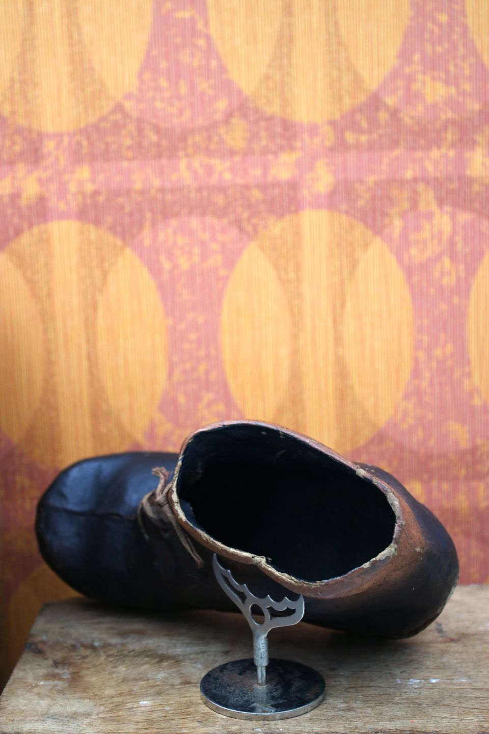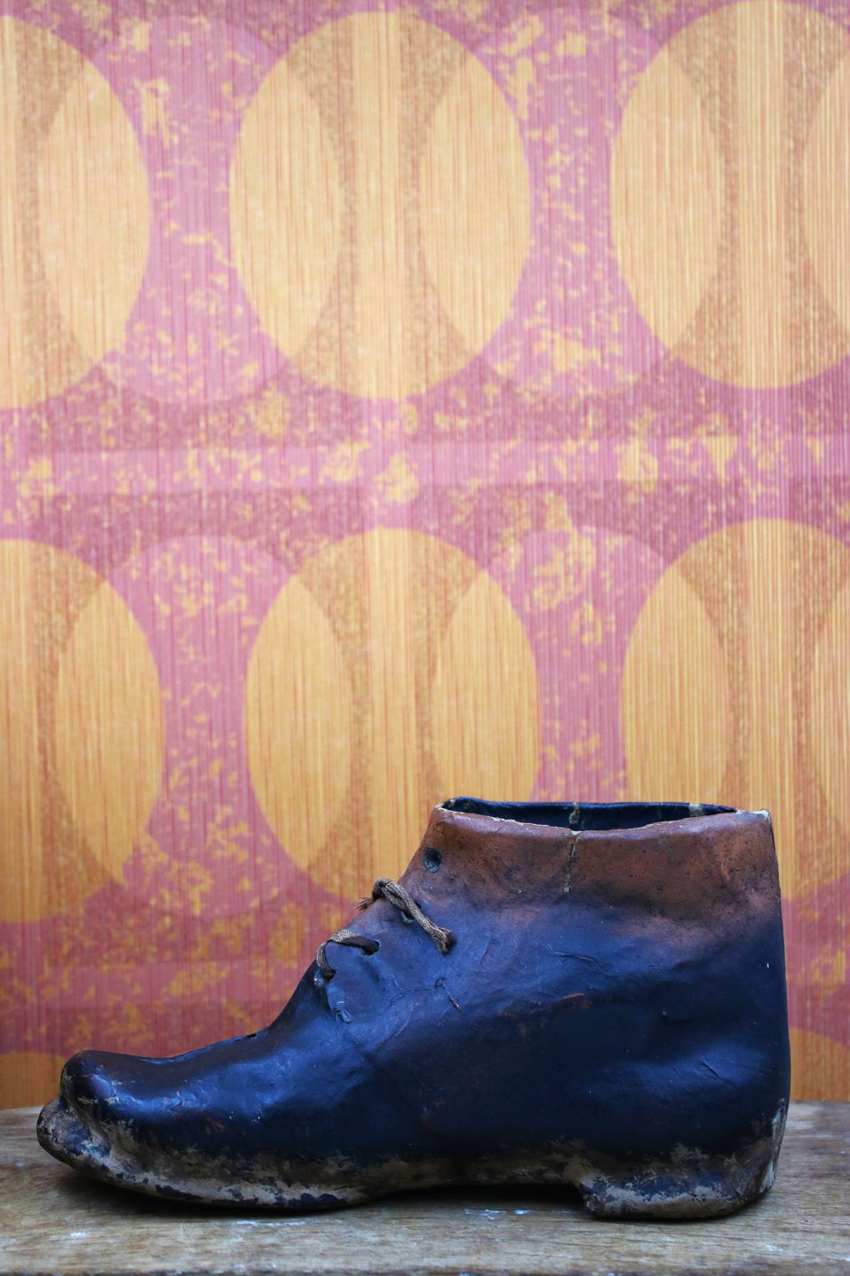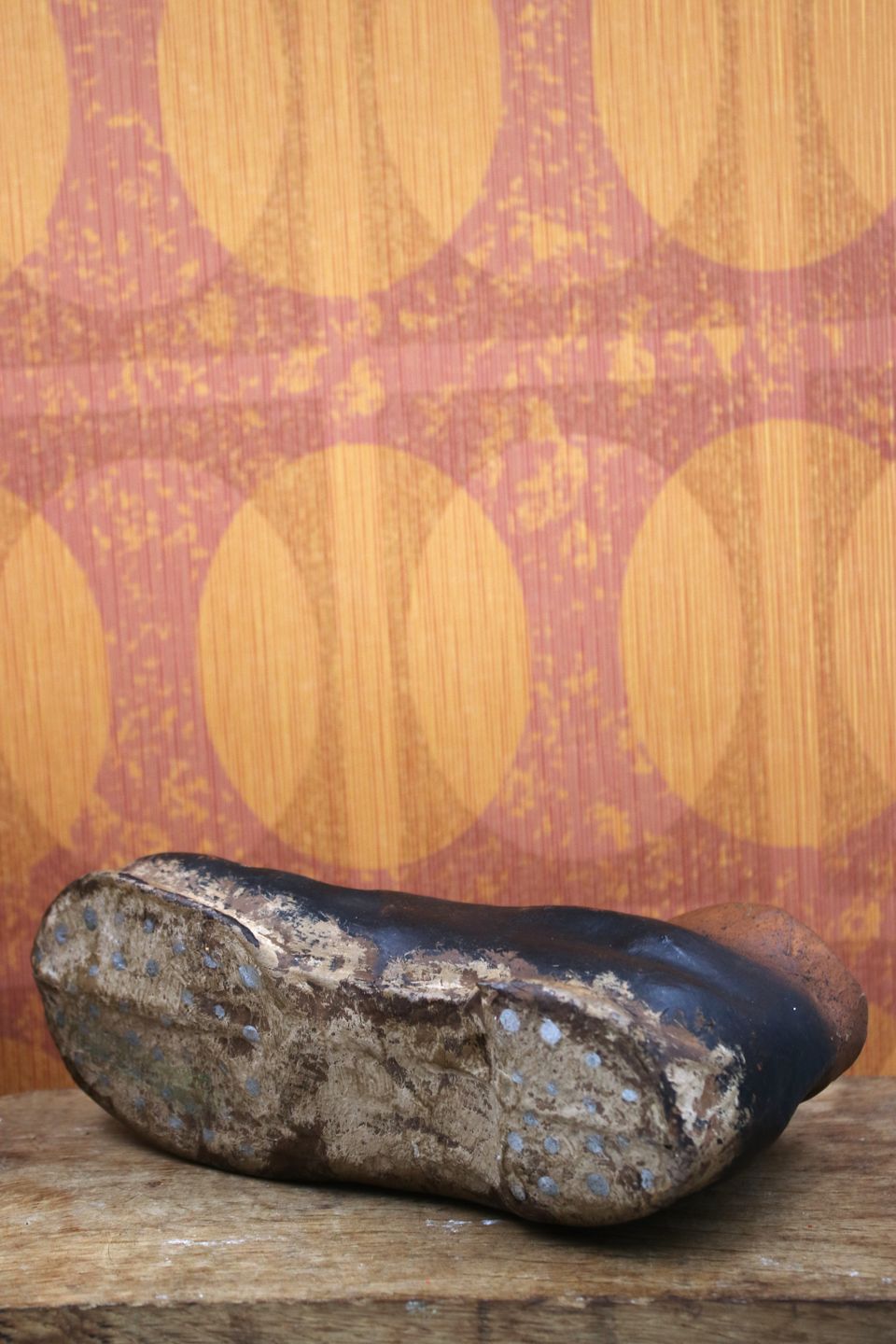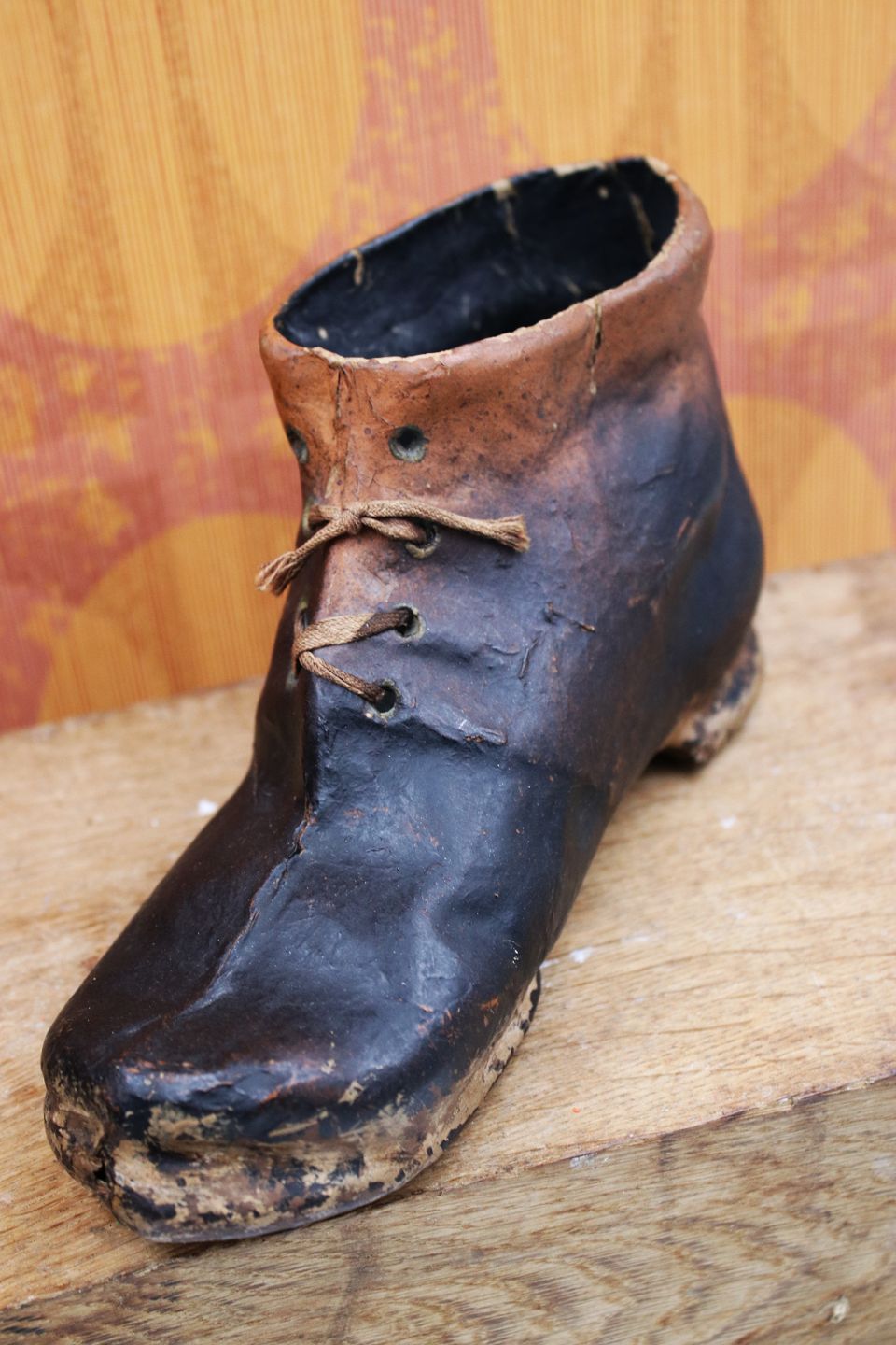 Dekorativ , gammel støvle i bemalet papmache med fin patina.