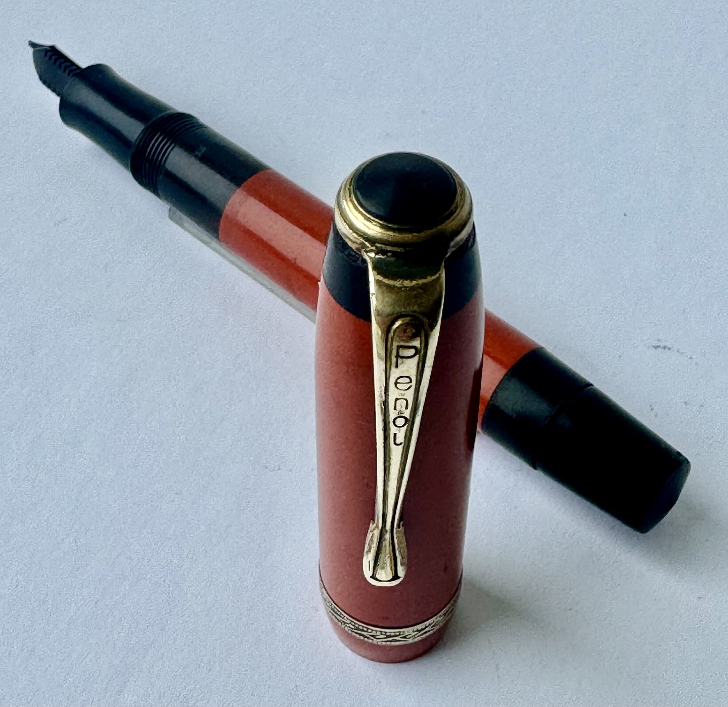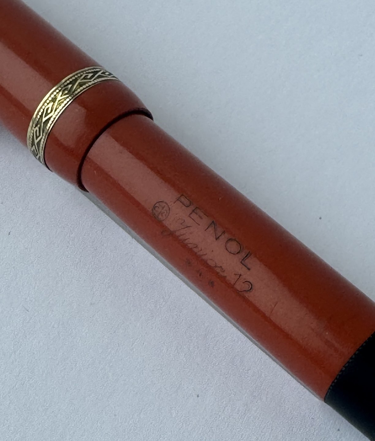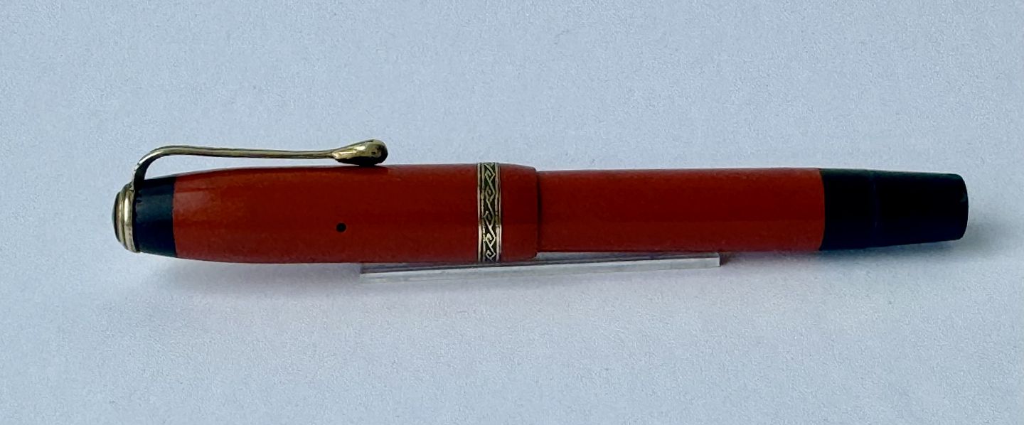 Mindre koralrød Penol Junior 12 fyldepen. Push button filler. Der skal indsættes en ny gummisæk før den igen kan optage blæk og skrive igen. Ny gummisæk kan indsættes for et tillæg på kr. 250,- Alle dele originale til denne model. Ingen skader eller reparationer. Lette almindelige brugsspor på overfladen. Længde 11,7 cm